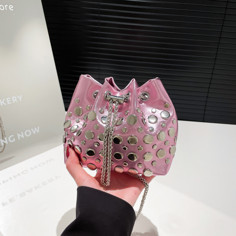 跨境爆款铆钉链条包女2025夏新款网红时尚斜挎包高级感洋气水桶包