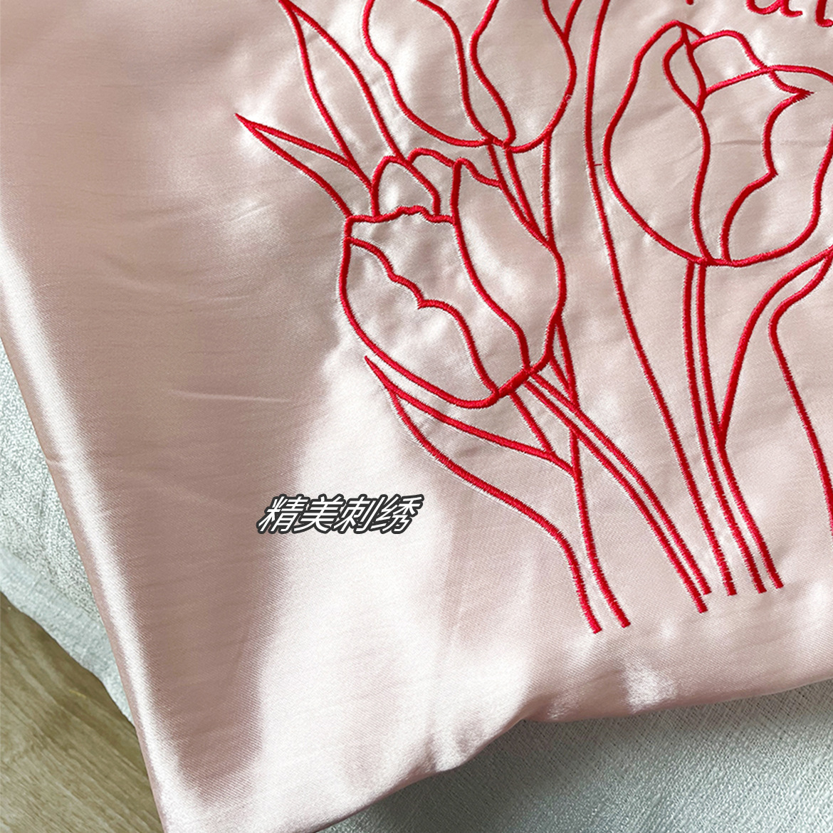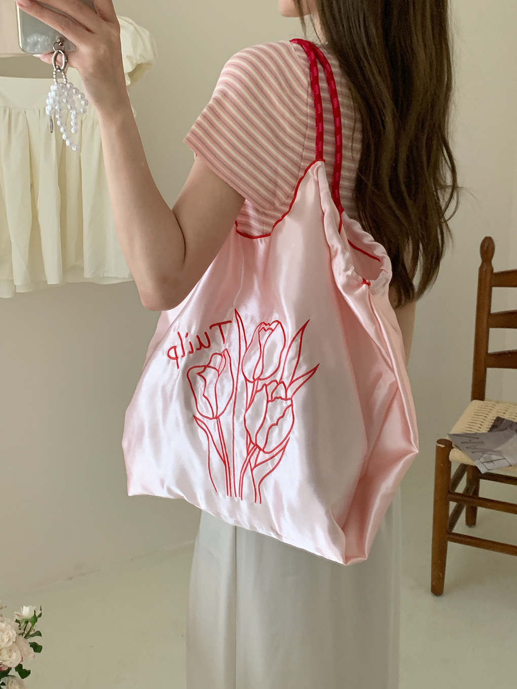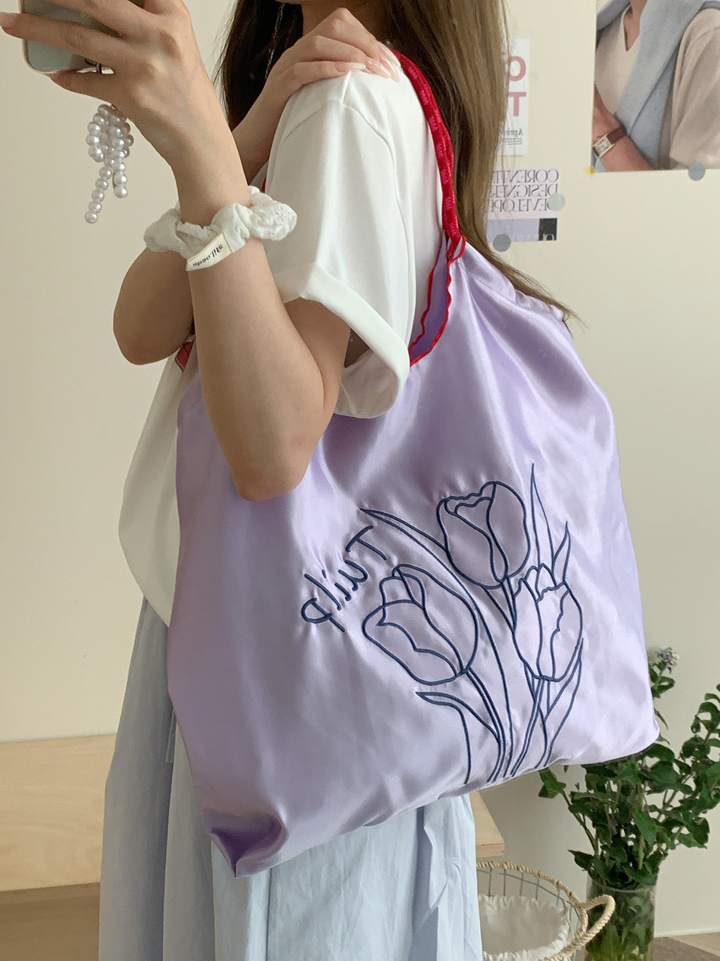 自制清新缎面抽绳托特包奶油系郁金香刺绣通勤包休闲百搭单肩包女