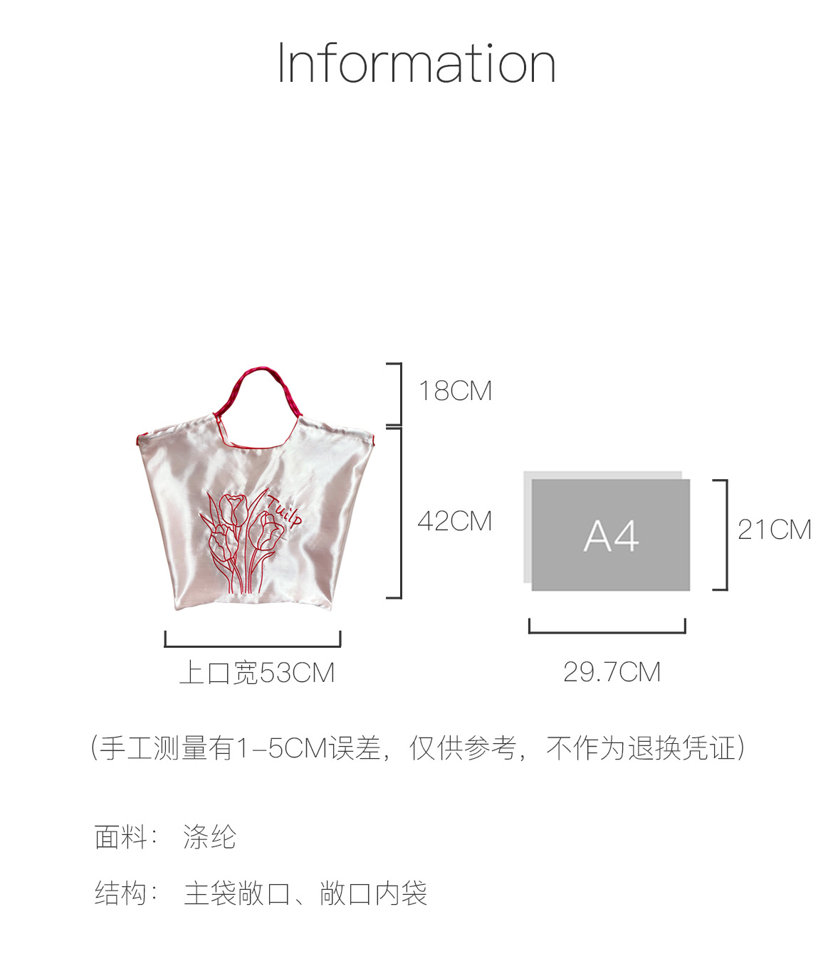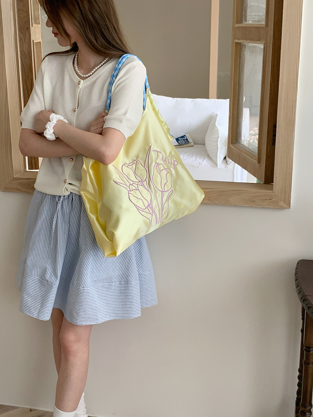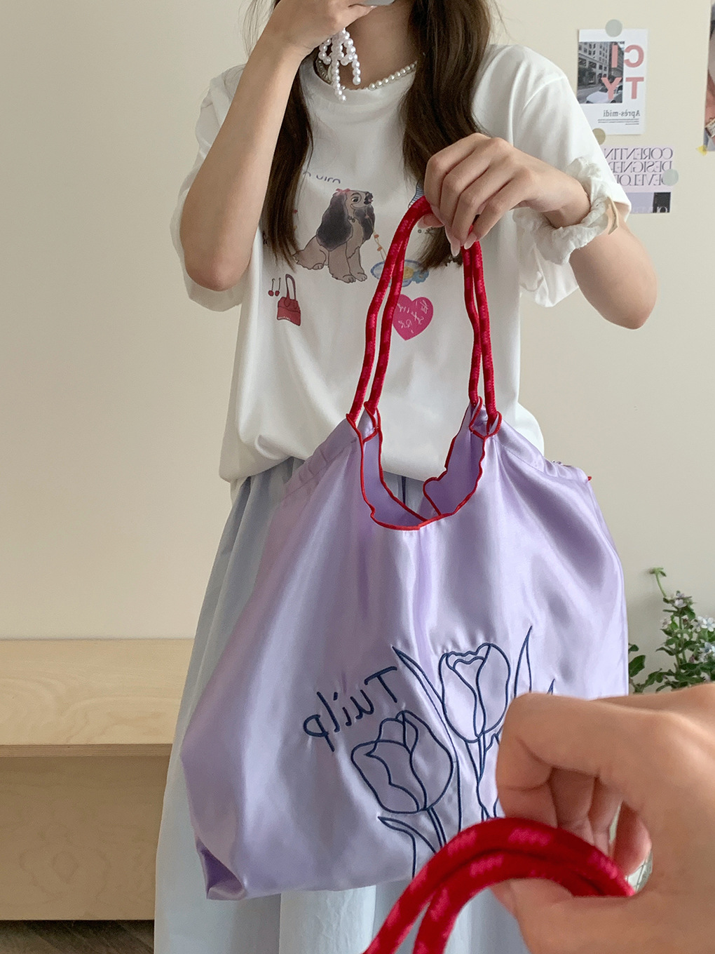 自制清新缎面抽绳托特包奶油系郁金香刺绣通勤包休闲百搭单肩包女