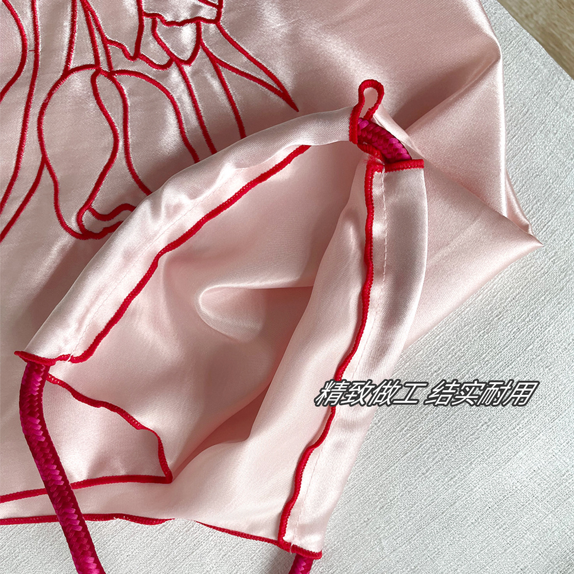 缎面刺绣花朵抽绳单肩包-粉色