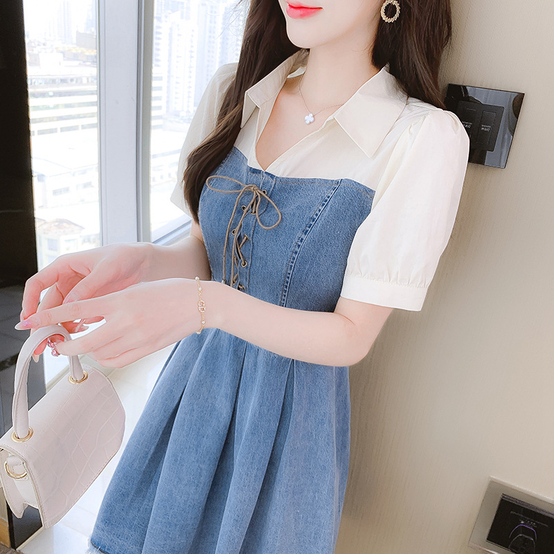 牛仔连衣裙夏季新款小个子收腰显瘦高级感撞色拼接衬衫百褶裙