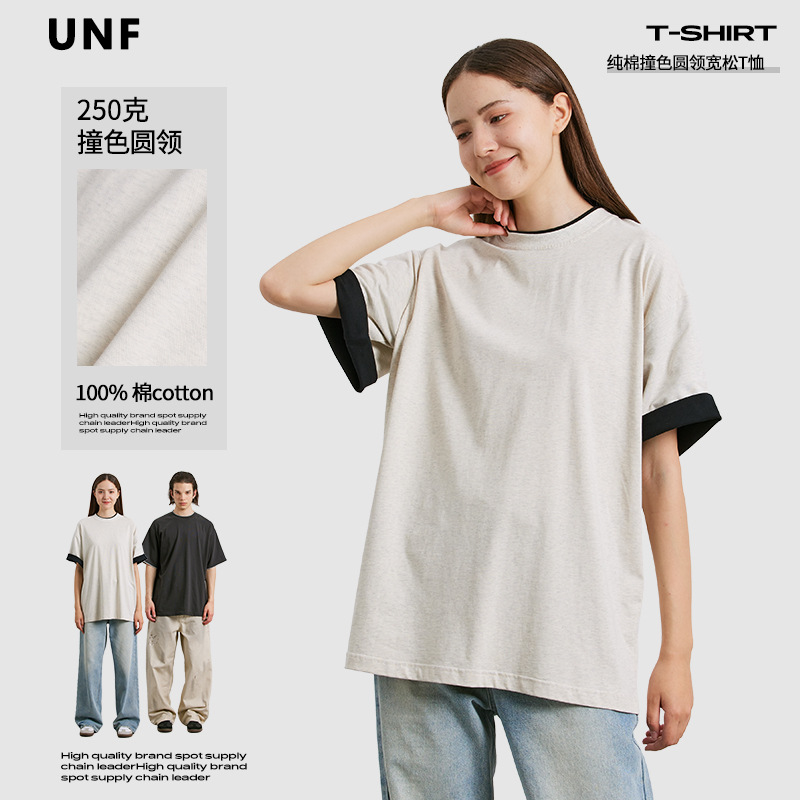UNF纯棉假两件基础款纯色T恤24春夏新品潮牌圆领宽松短袖上衣男女