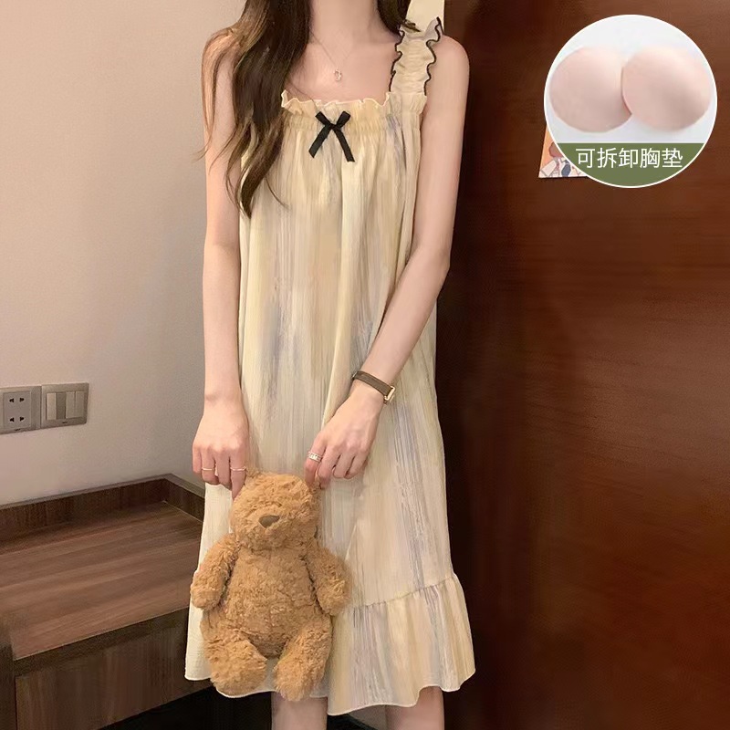 可拆卸带胸垫睡裙夏季女性感吊带薄款甜美连体泡泡棉可外穿家居服