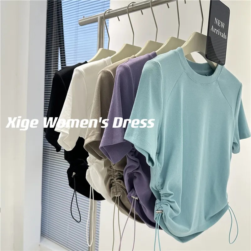韩版字母刺绣正肩短袖t恤女设计感抽绳收腰显瘦百搭圆领打底上衣