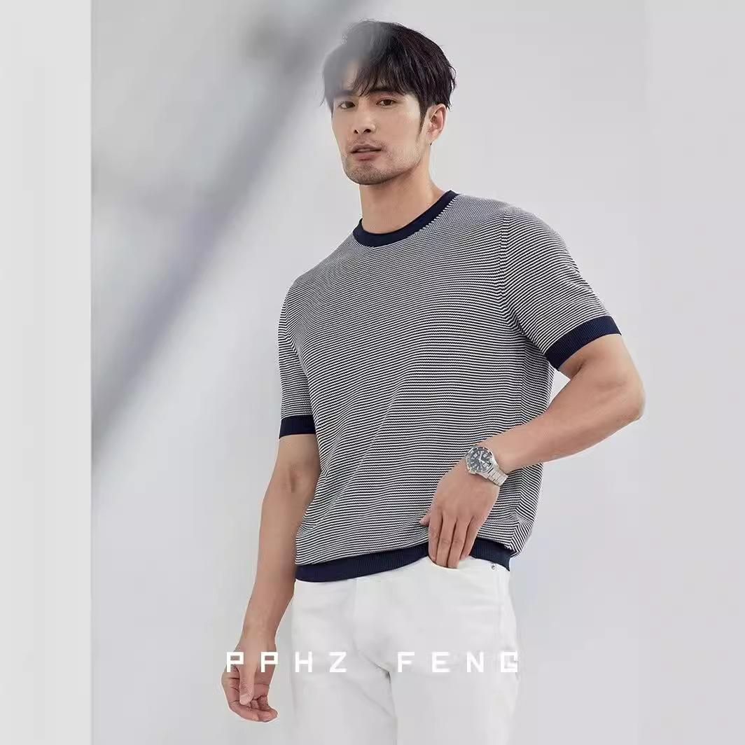 冰丝圆领针织衫短袖夏季t恤细条纹帅气半截袖打底透气薄款撞色T恤