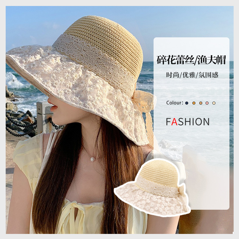 夏季新款沙滩帽女甜美气质网纱碎花渔夫帽飘带蝴蝶结显脸小遮阳帽