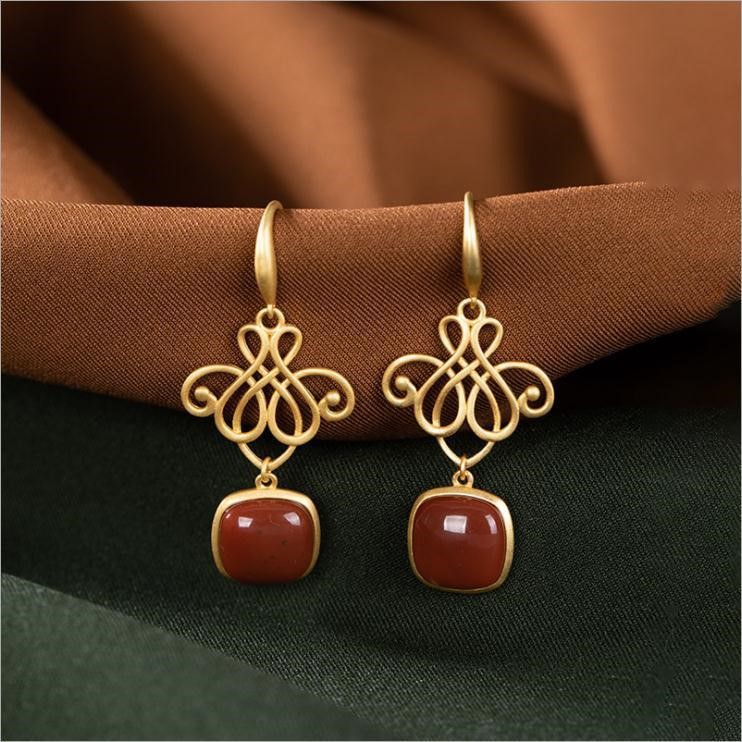 s925银红方形耳坠女款吉祥结耳饰帝王南红几何镀金耳环