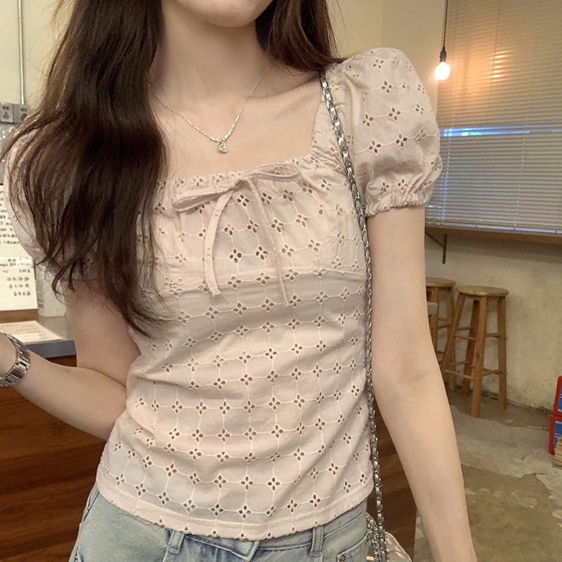 今年流行漂亮镂空泡泡袖系带方领纯棉短袖T恤女夏季新款甜辣上衣