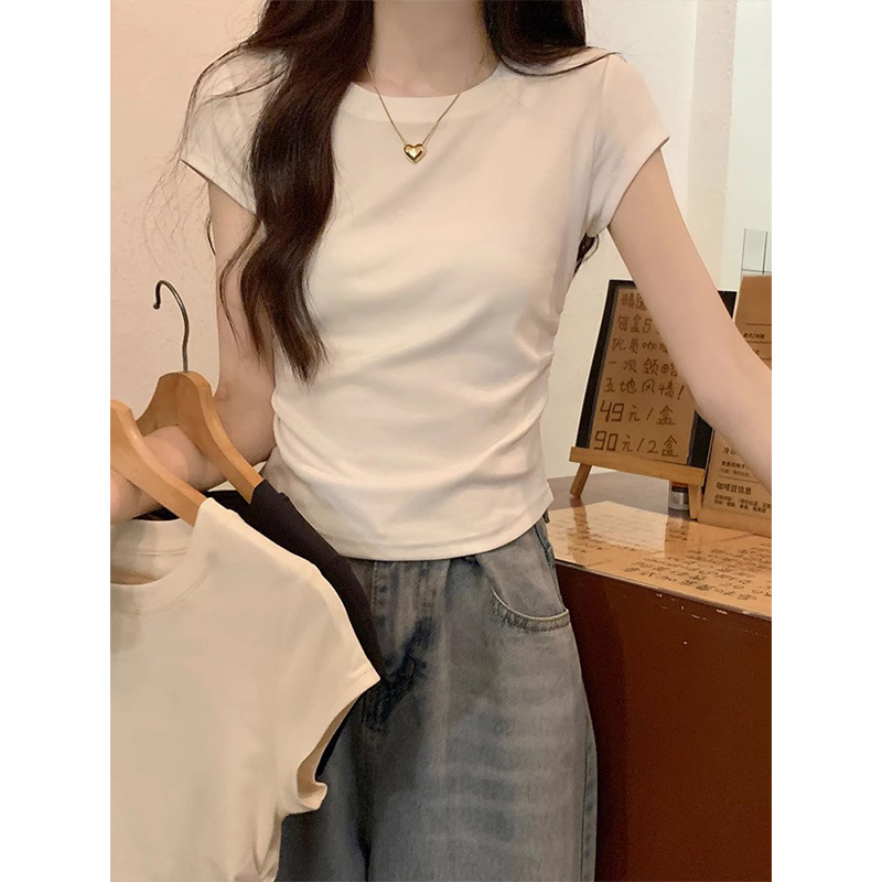 正肩短袖T恤女夏季紧身褶皱显瘦不规则设计感短款小个子体桖上衣