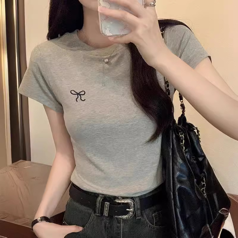 纯欲绝美设计感蝴蝶结圆领短袖T恤女夏季韩版正肩短款修身小上衣