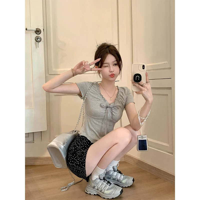 夏季v领修身显瘦木耳边正肩t恤女短袖芭蕾风甜辣短款小个子上衣服