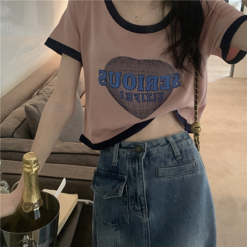 冰丝螺纹甜辣风撞色短袖T恤女2025新款粉色短款露脐打底衫欧货潮