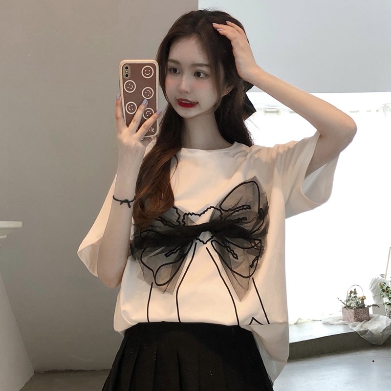 短袖t恤女设计感小众夏季新款网纱蝴蝶结别致纯棉半袖宽松上衣ins
