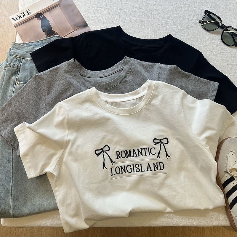 韩系蝴蝶结英文刺绣短袖t恤女夏季新款ins宽松显瘦洋气通勤上衣潮