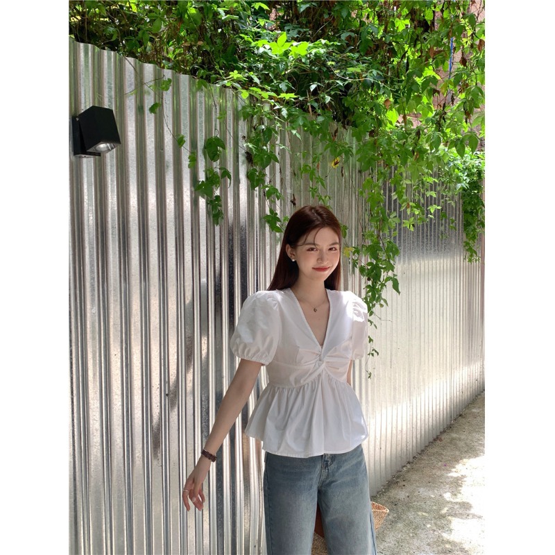 法式气质泡泡袖V领设计感小众甜美白色衬衫女装夏季宽松休闲上衣
