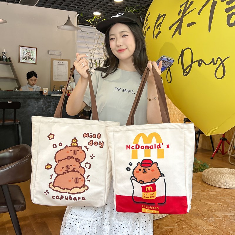 个性创意学生补习日常大容量单肩麦当劳水豚帆布袋休闲百搭托特包