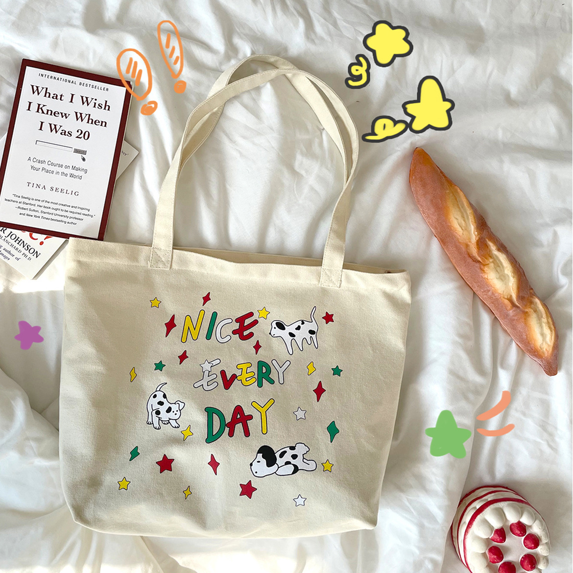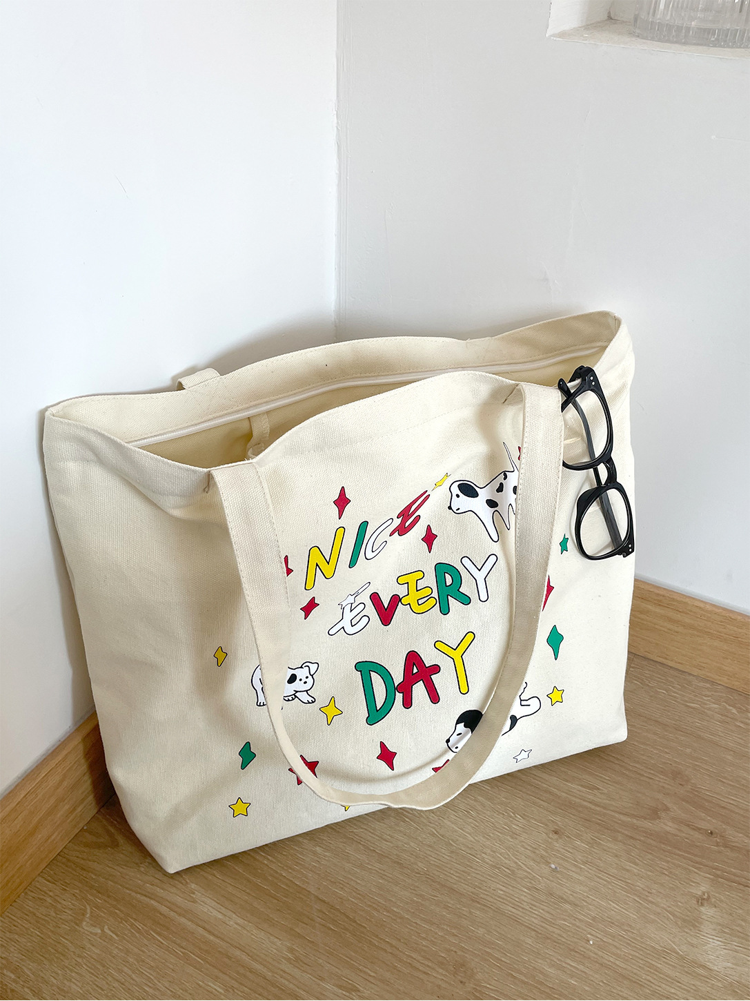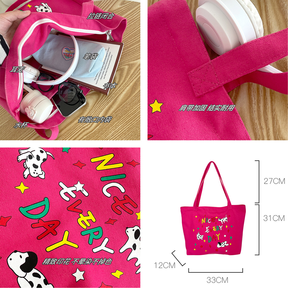 新款学生书包可爱插画帆布袋大容量单肩包拉链帆布包托特包女