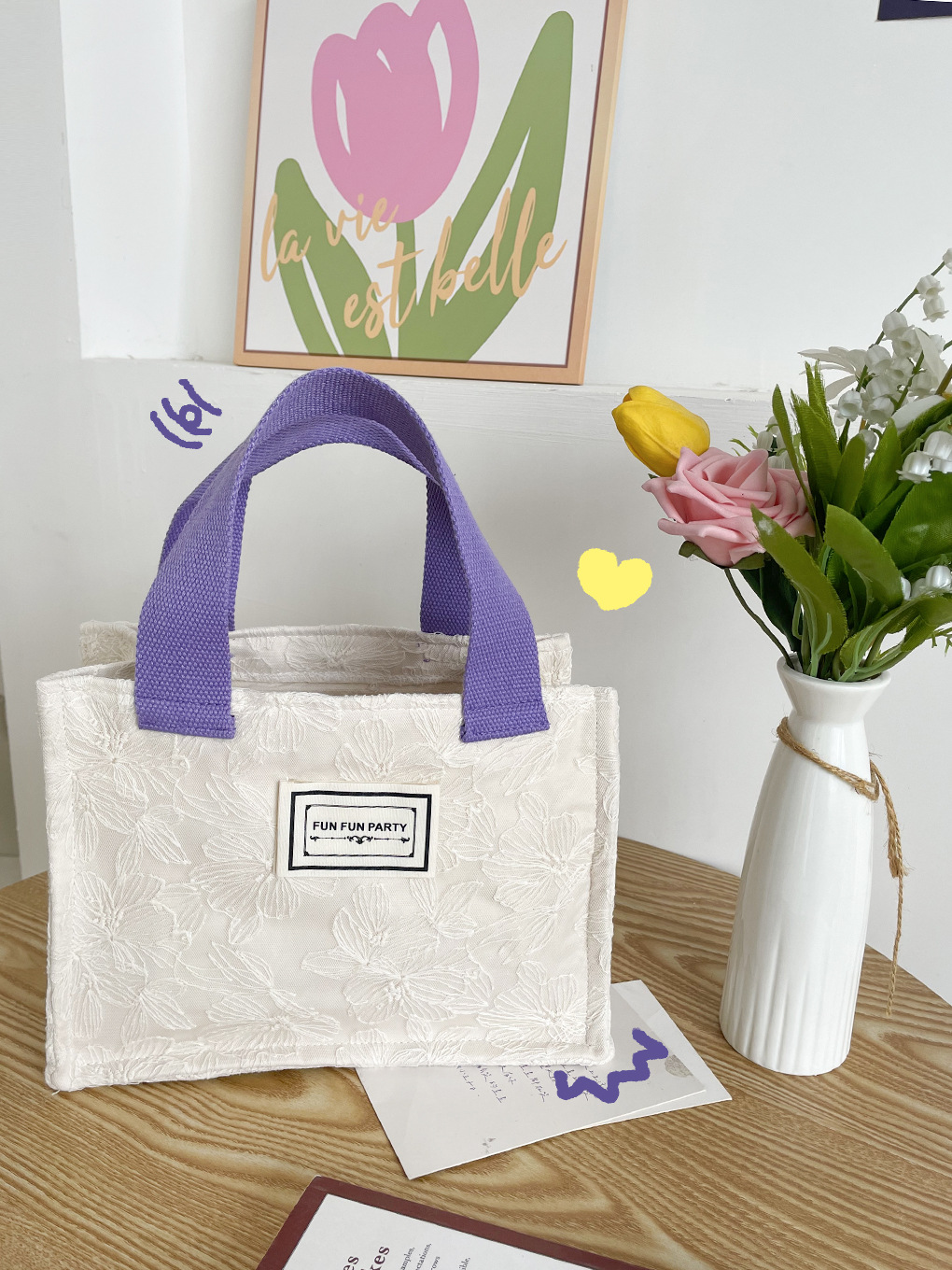 黄蕾丝紫带小方包