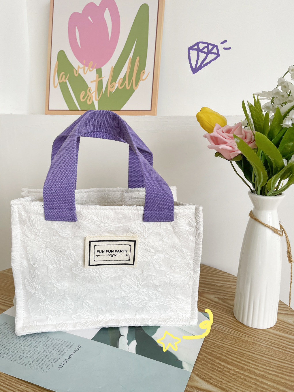 白蕾丝紫带小方包