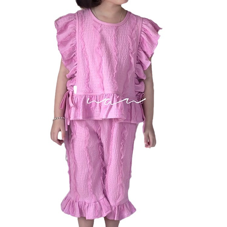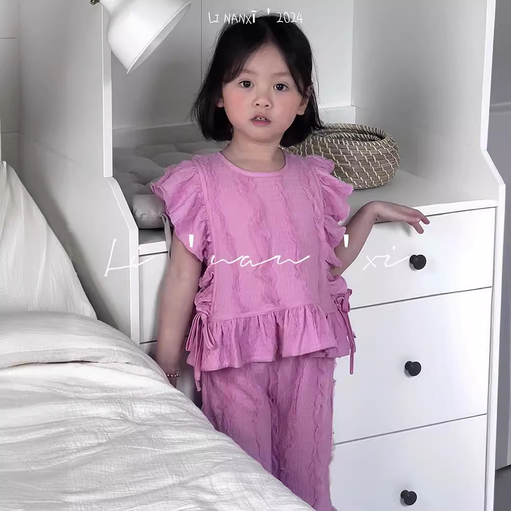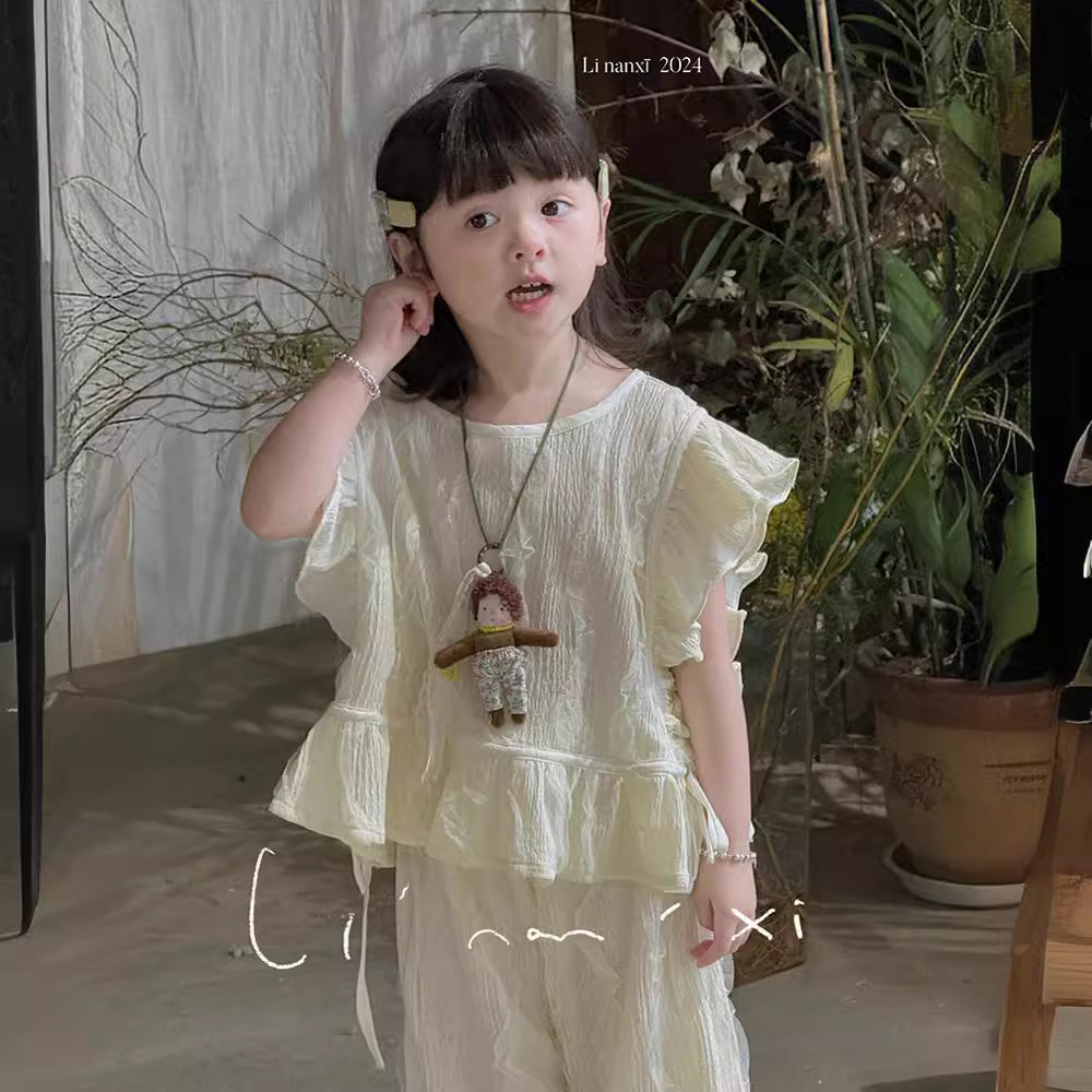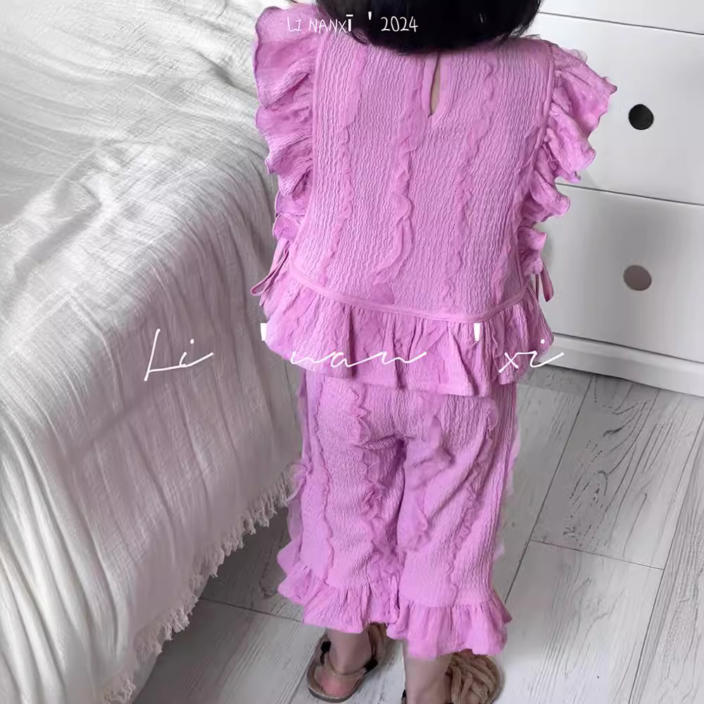 24夏款新品女童套装特种提花甜美花边上衣+裤子荷叶边公主两件套