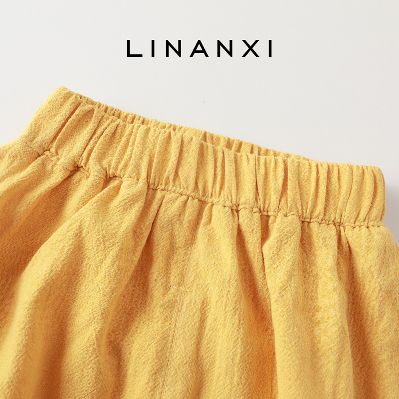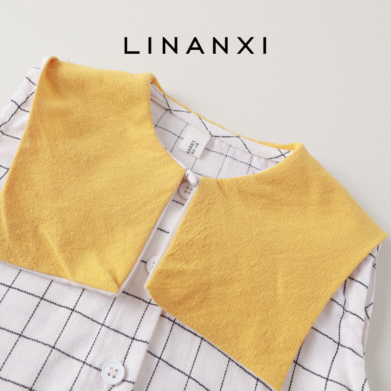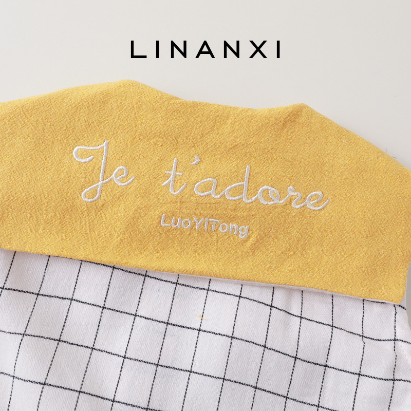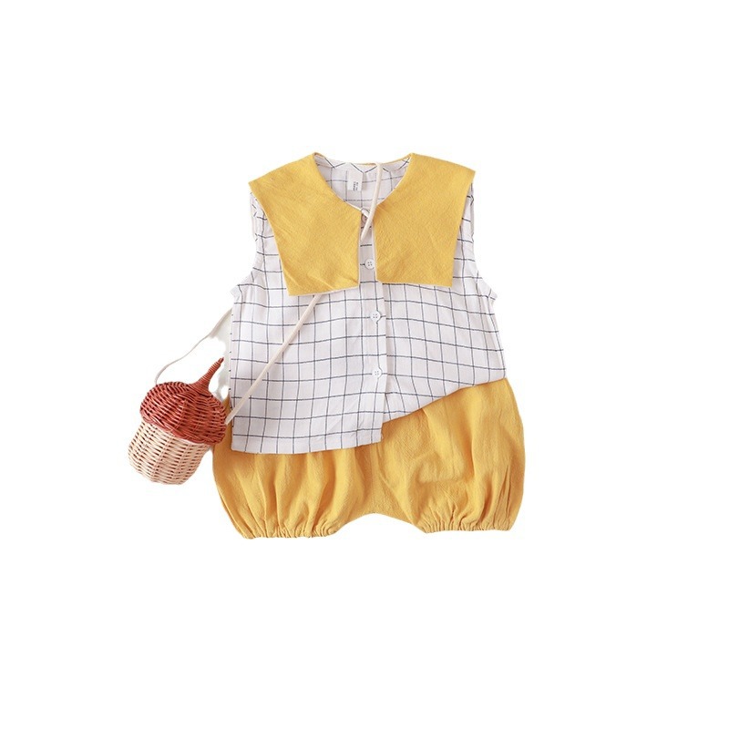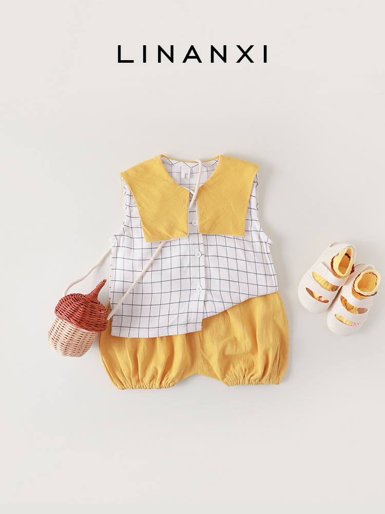 24新夏款男女童套装纯棉色织格子宝宝两件套方领短袖衬衣+南瓜裤