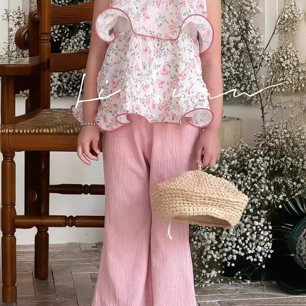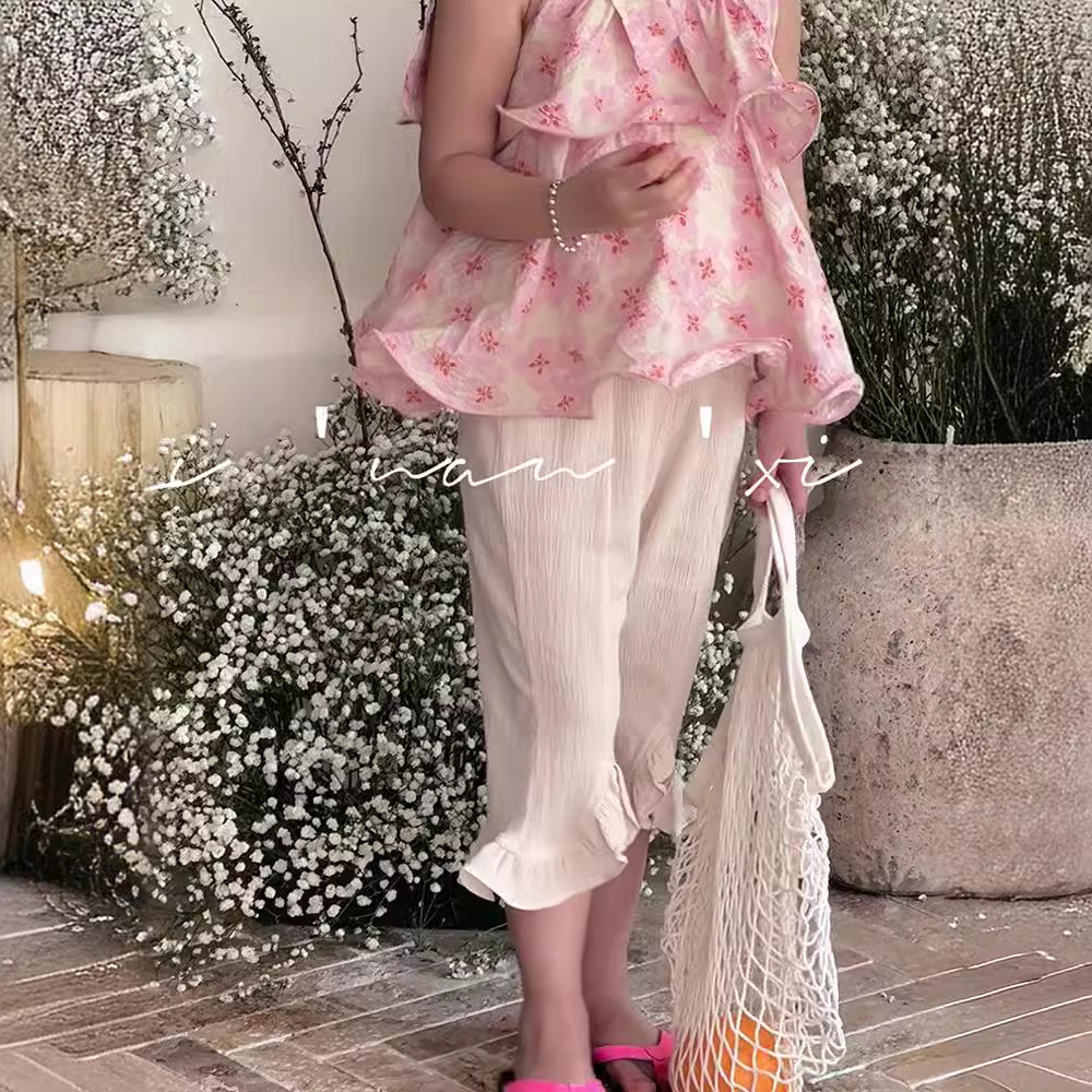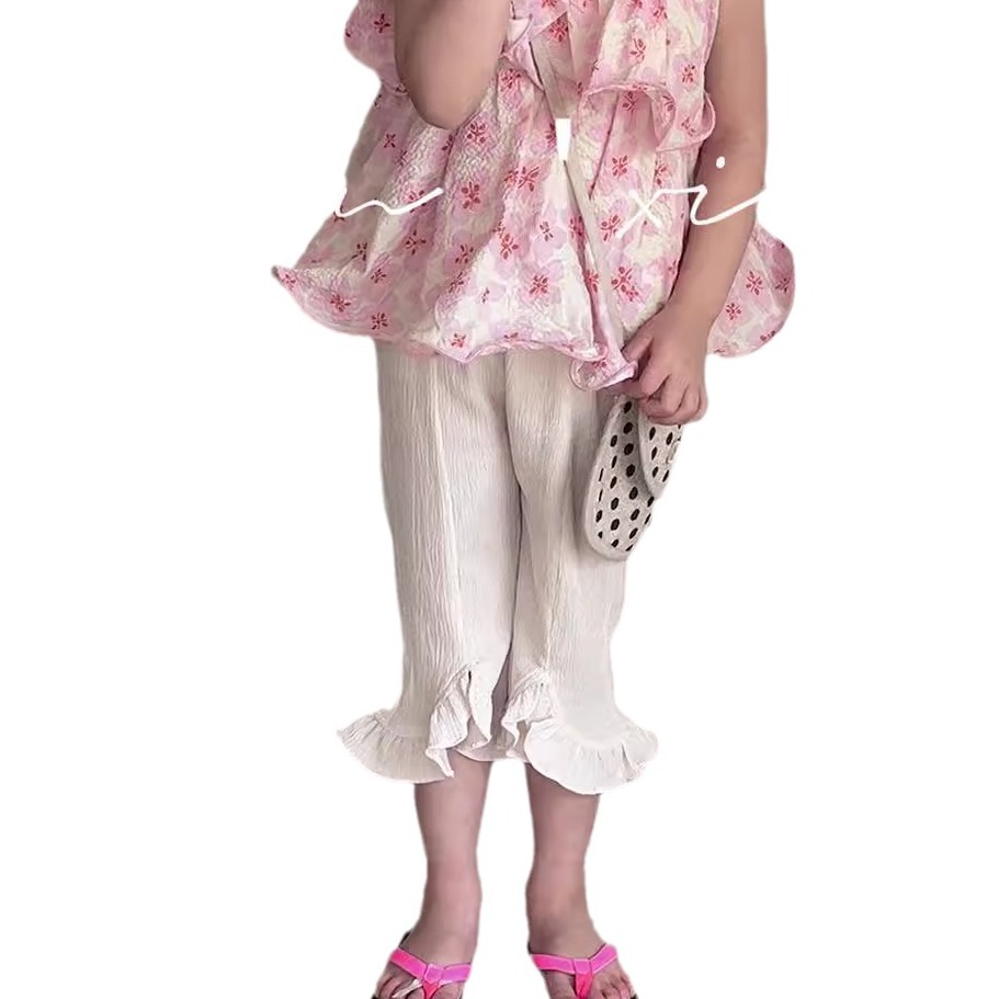 24夏新款女童针织喇叭裤宝宝百搭花边中裤3-8岁女宝轻薄七分裤