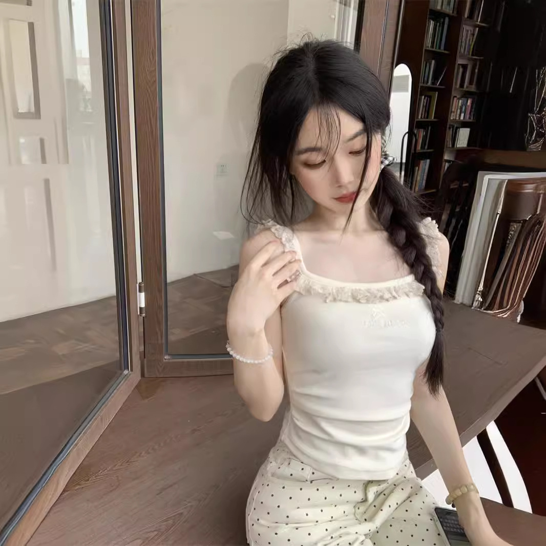 纯棉夏季甜美风木耳边拼接小吊带女夏季纯欲抽褶修身短款背心上衣