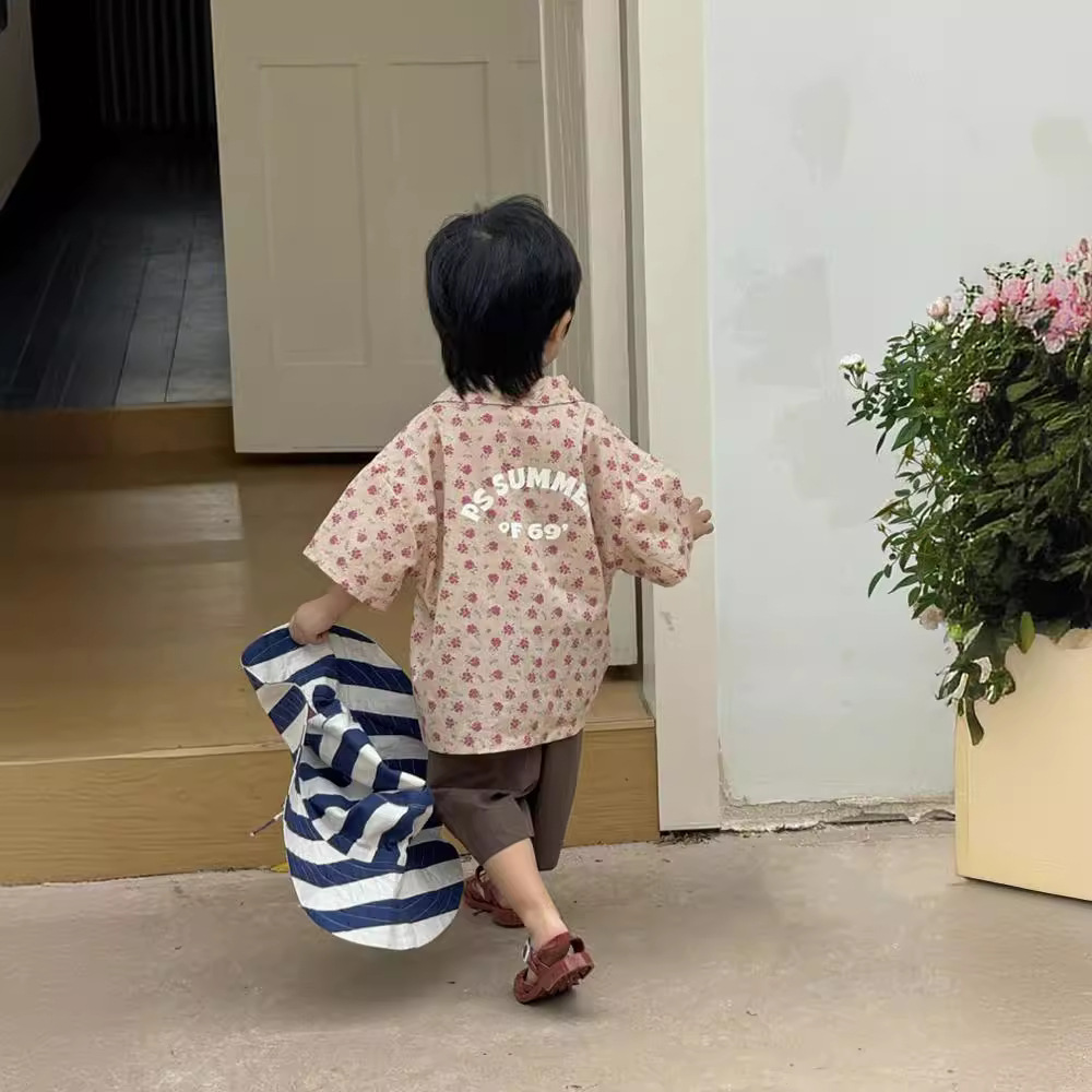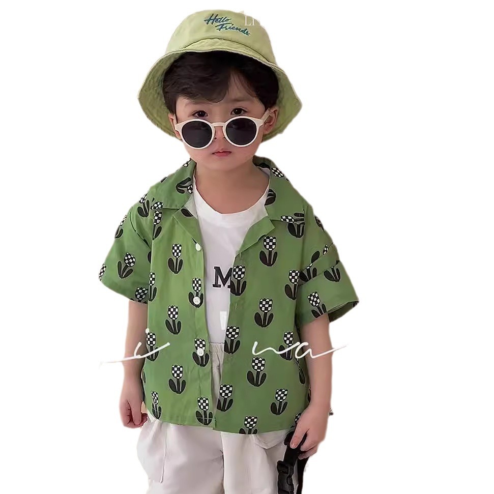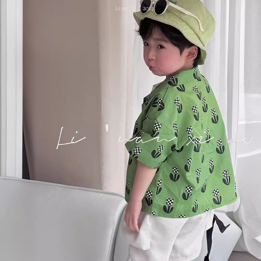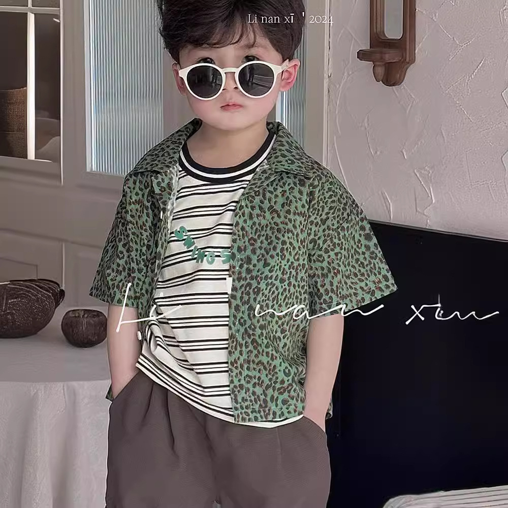 24夏新款男童花衬衣儿童豹纹度假风环保数码印花上衣宝宝全棉短袖