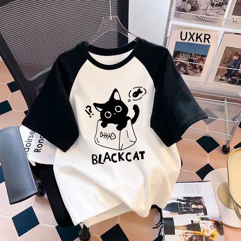 学生夏季卡通黑白撞色插肩袖短袖t恤女2025新款宽松洋气时尚上衣