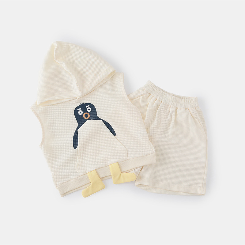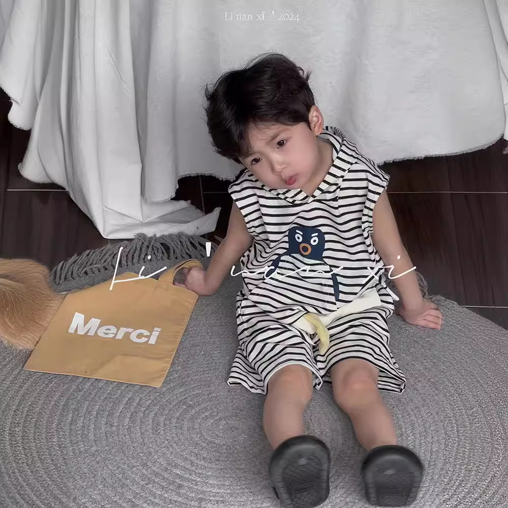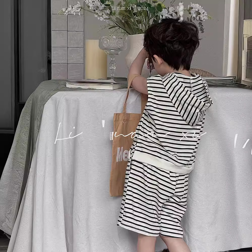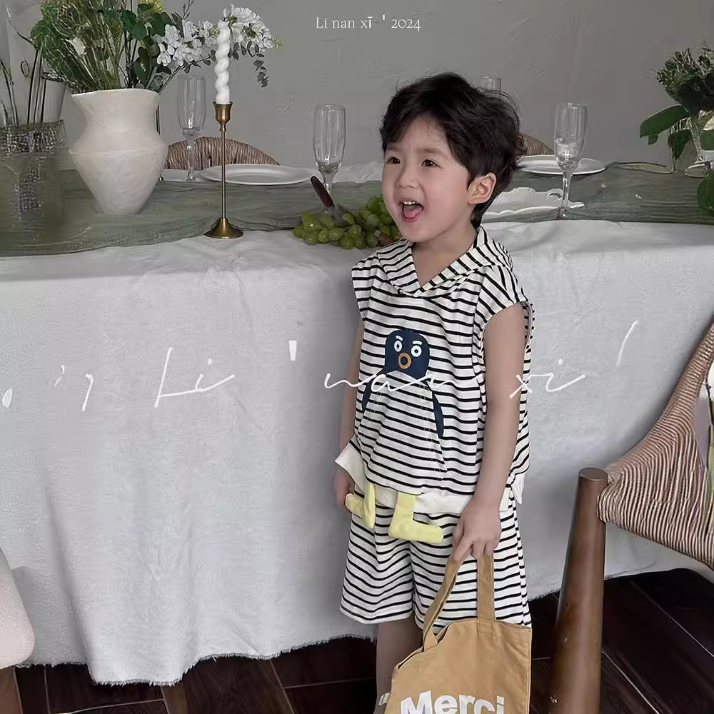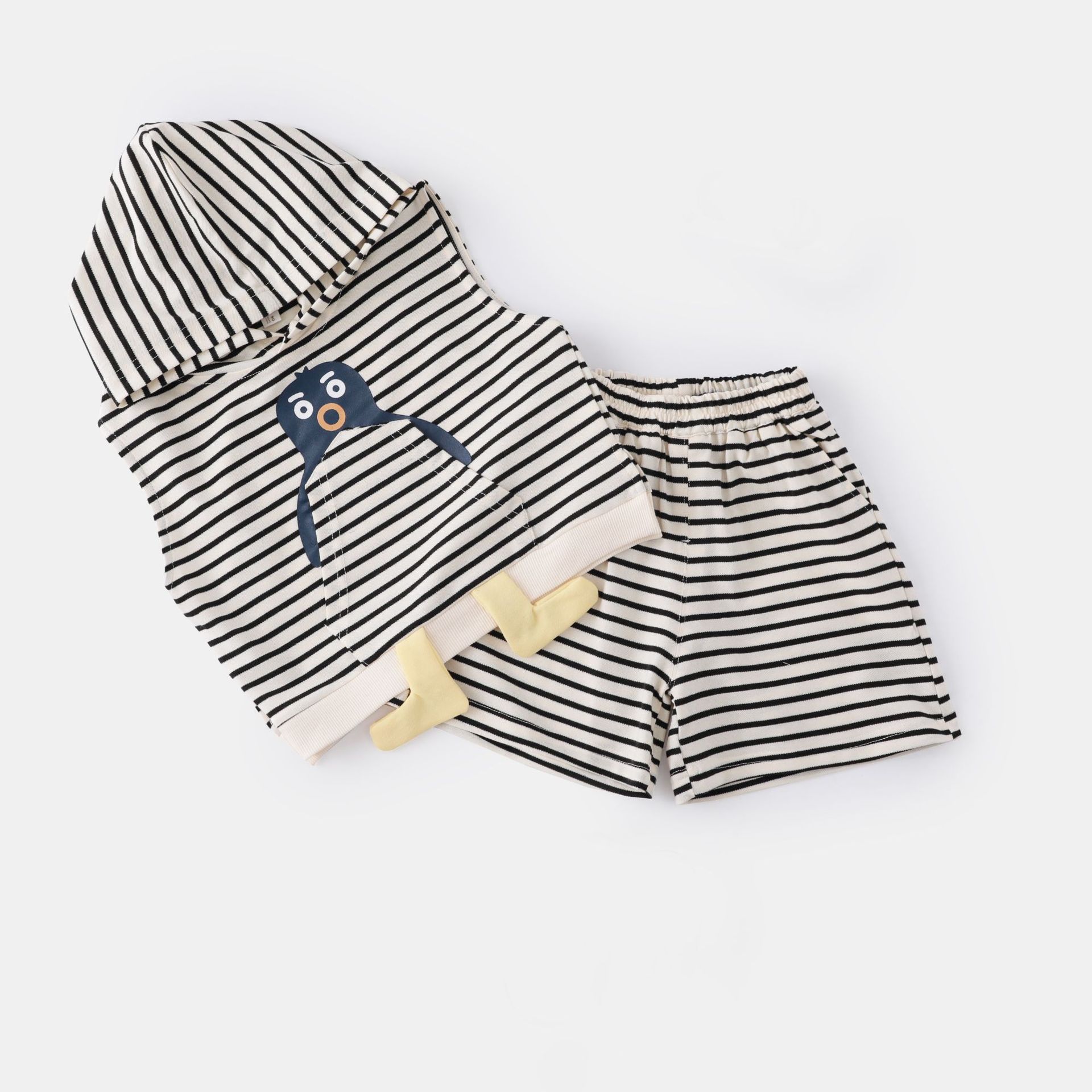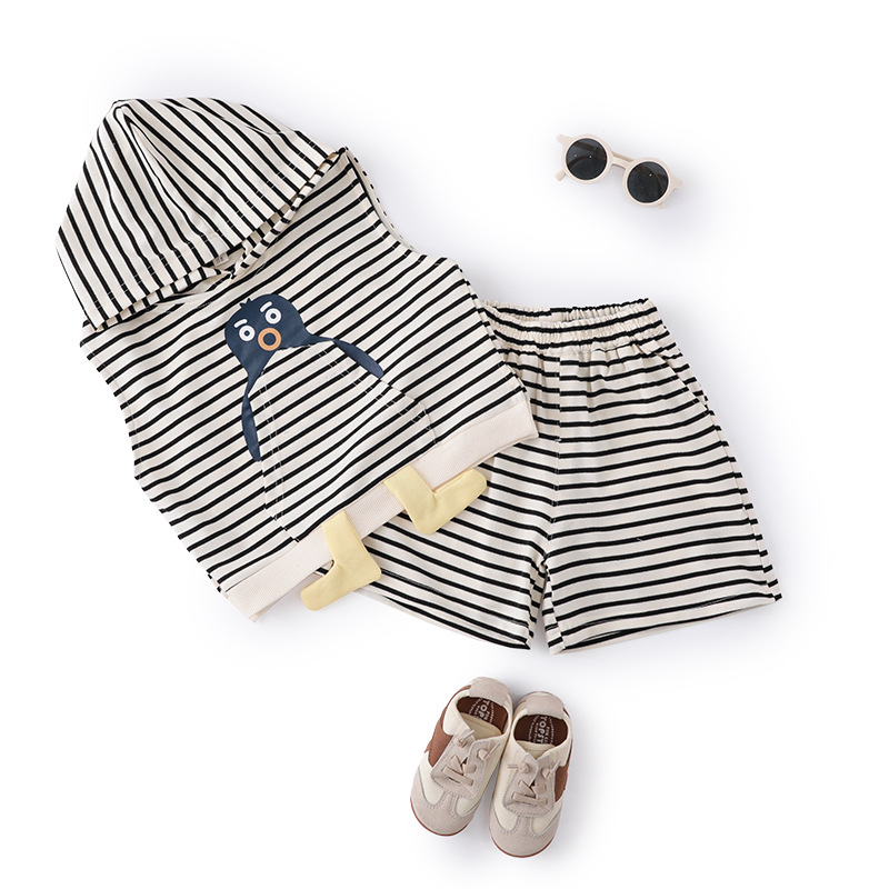 50004夏季新款儿童套装男童卡通T恤+短裤宝宝连帽针织条纹两件套
