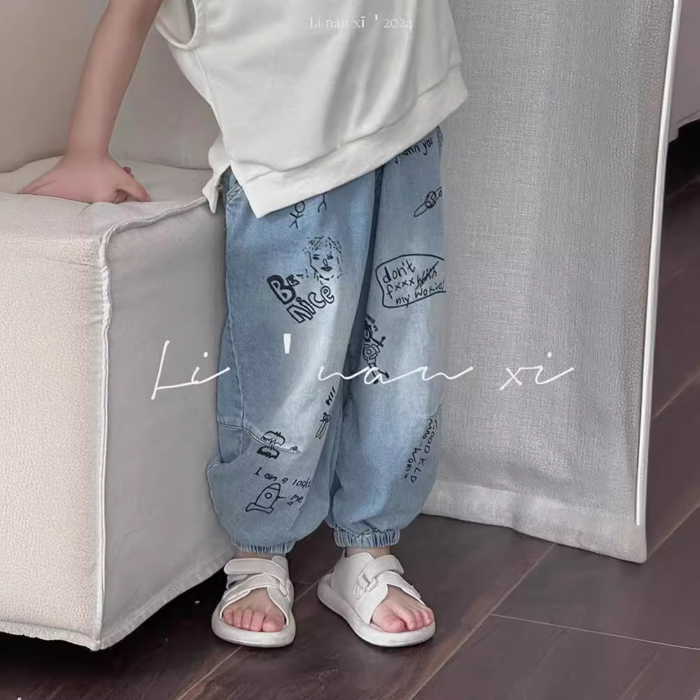 24新款男童防蚊裤儿童薄牛仔长裤男女天丝棉轻薄涂鸦休闲裤