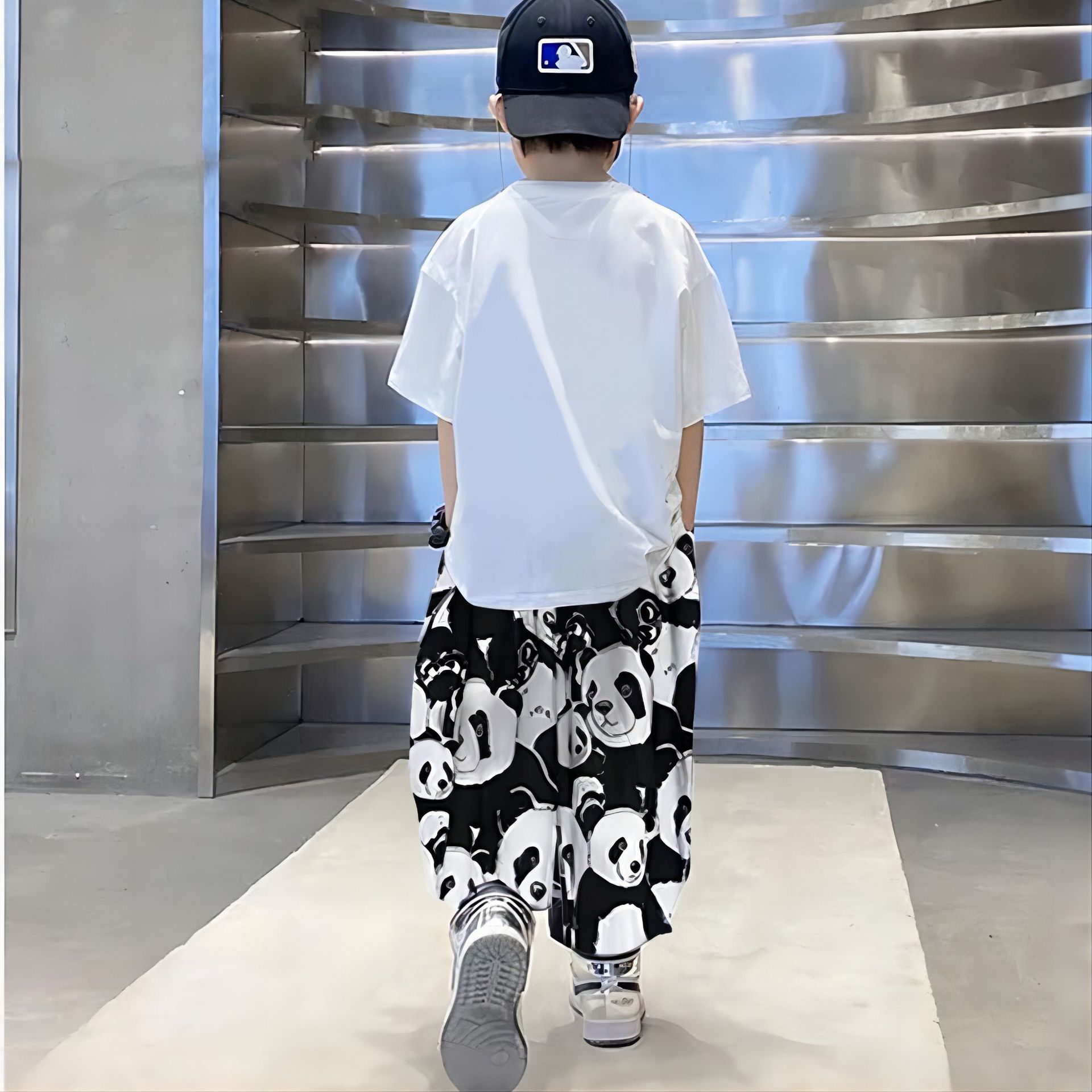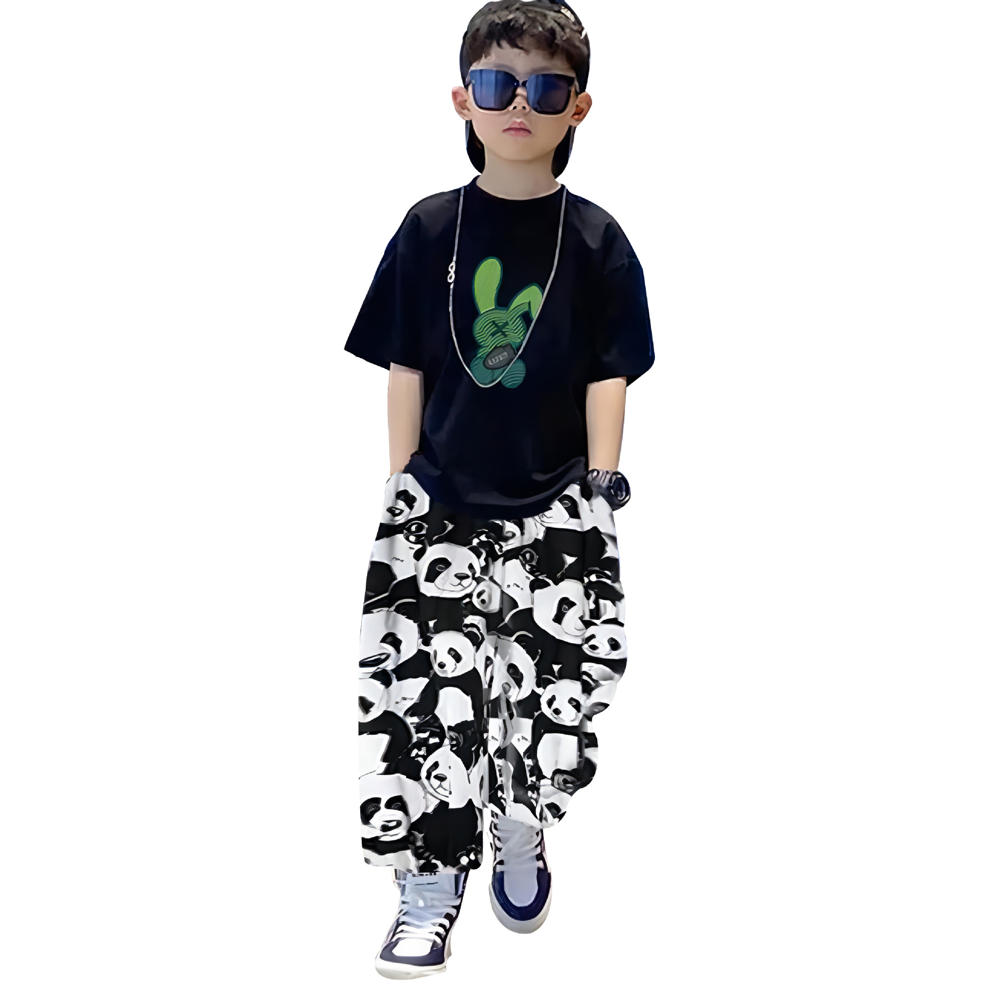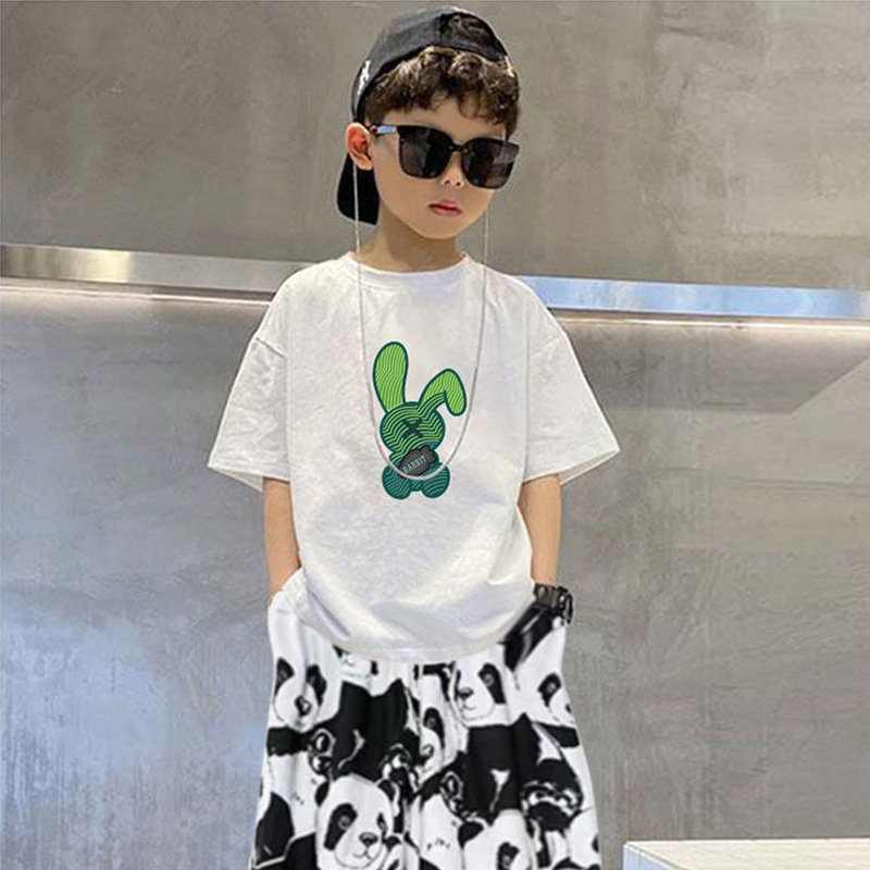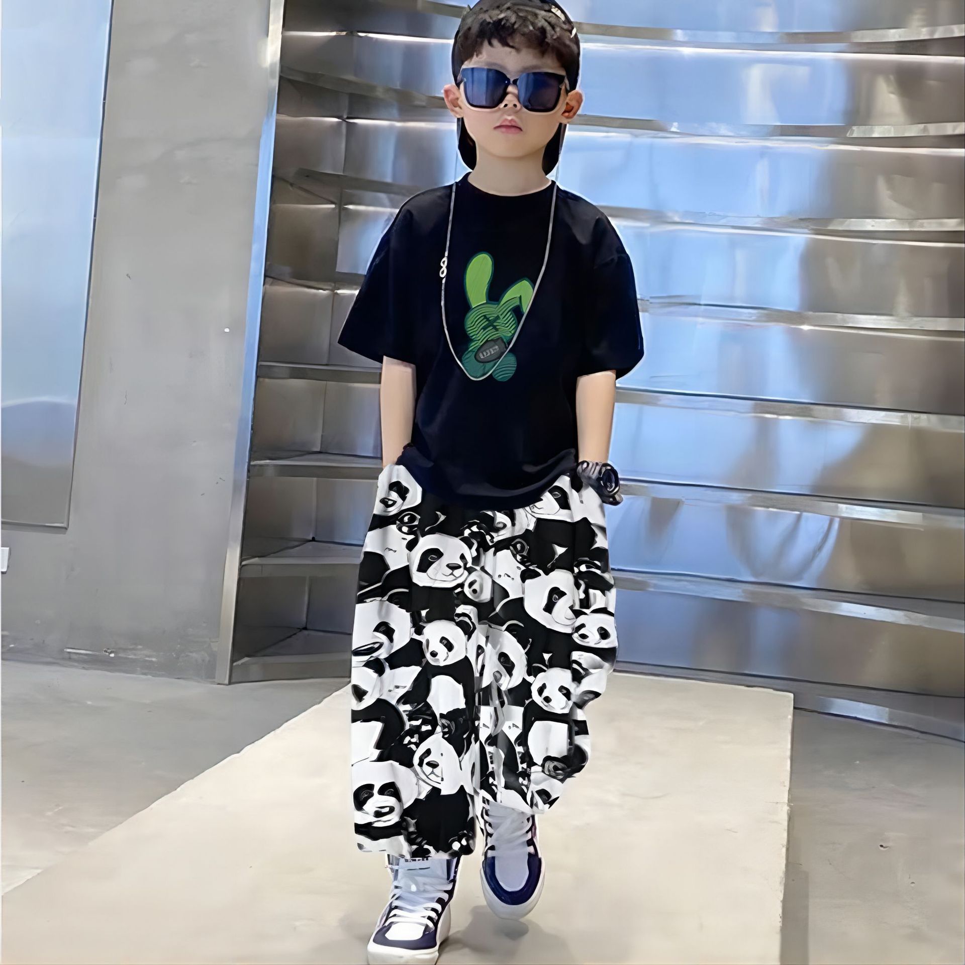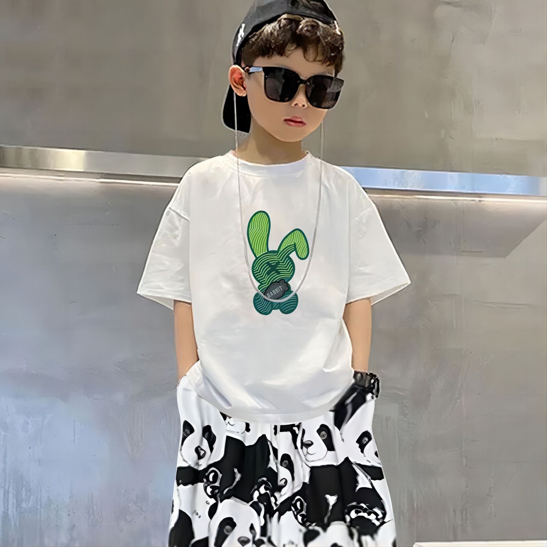 男童夏季薄款卡通T恤五分裤两件套2025新款大童美式街头嘻哈套装
