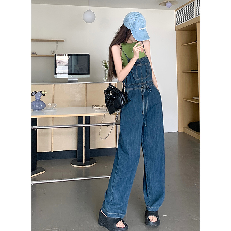 春夏韩版薄款牛仔背带裤女复古收腰抽绳宽松直筒阔腿连体长裤