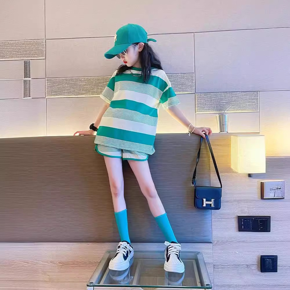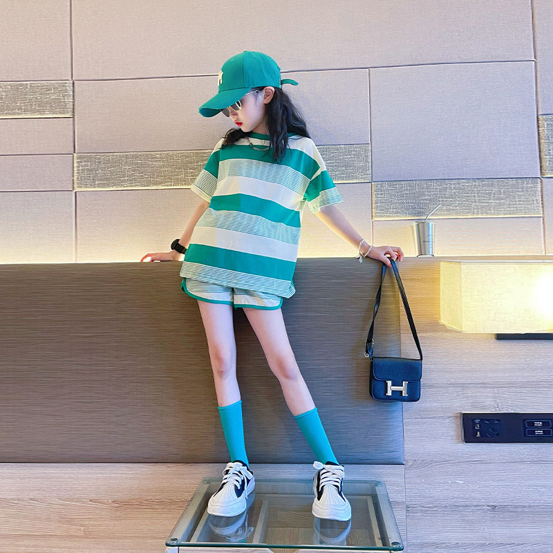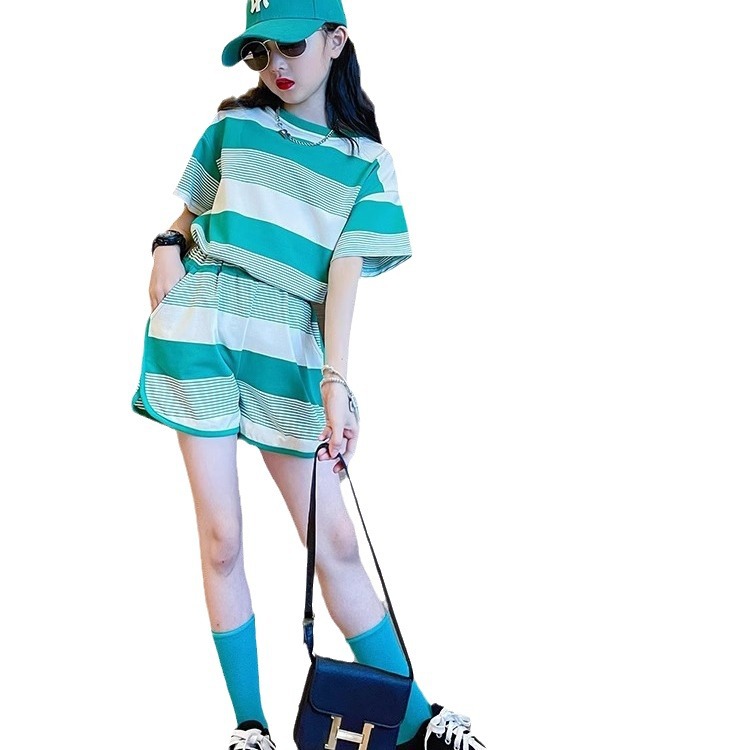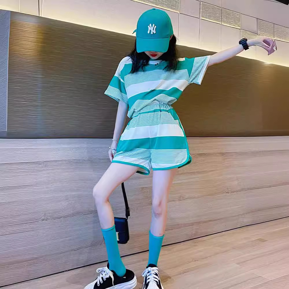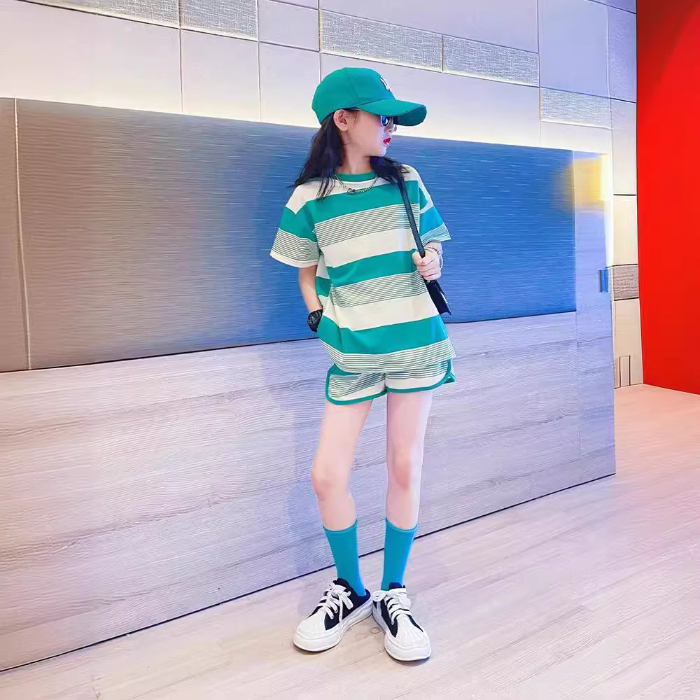 女童条纹套装夏季薄款短袖短裤洋气中大童宽松休闲两件套跨境