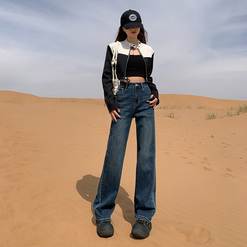早秋直筒裤牛仔裤女弹力高腰显瘦时尚水洗复古蓝烟管裤修身百搭