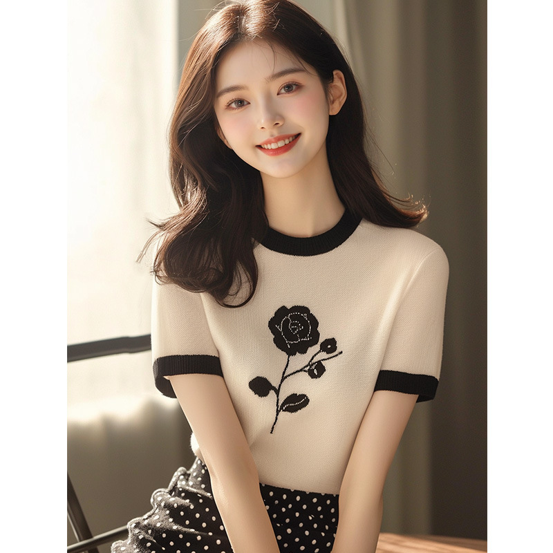 新款爆款夏季小众别致设计感上衣针织正肩冰丝短袖t恤女夏款