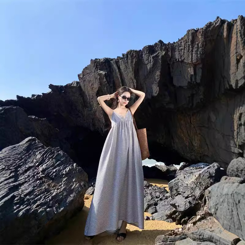 高光旋律 格纹吊带连衣裙女夏季新款宽松露背长裙抹胸裙