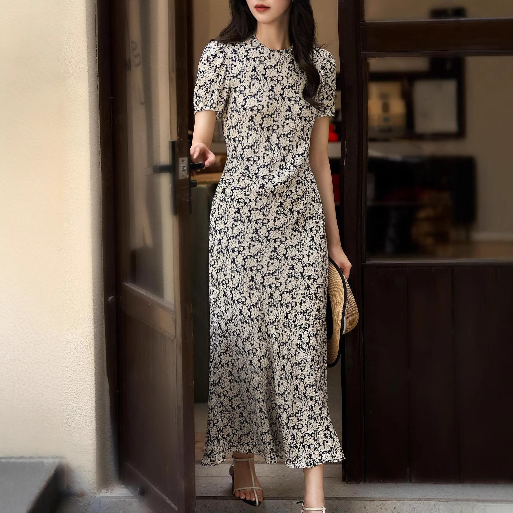 上身巨好看~立体收腰灵巧鱼尾摆黑白碎花长裙夏季女新款