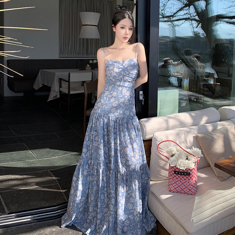 露背吊带裙女碎花一字肩连衣裙三亚海边度假沙滩裙长裙收腰及踝