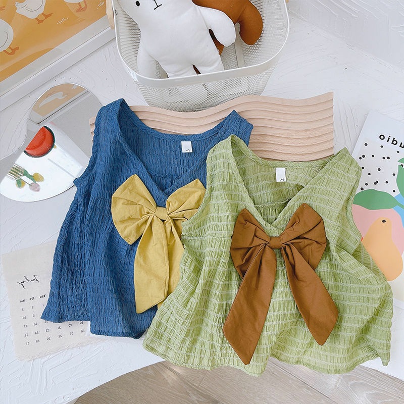 女童夏装背心宝宝网红洋气儿童个性潮韩版V领蝴蝶结无袖甜美上衣