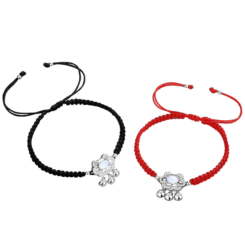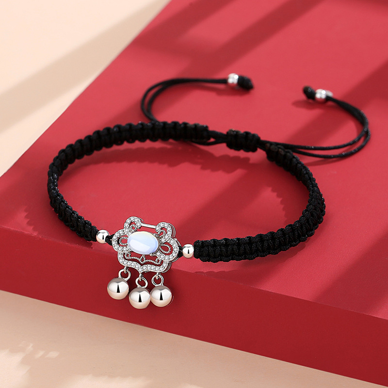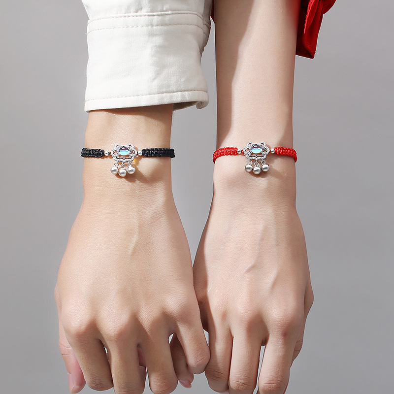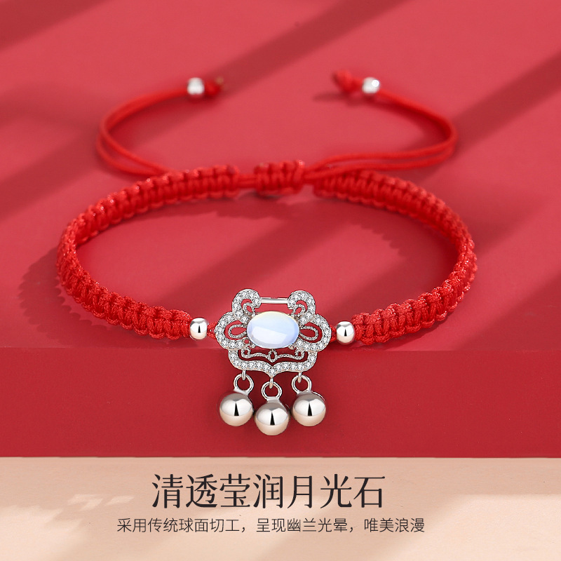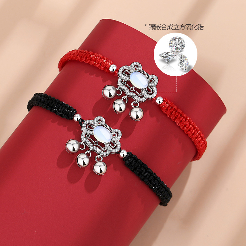 实拍月光石平安锁情侣手链一对S925纯银国潮本命年如意锁编织红绳
