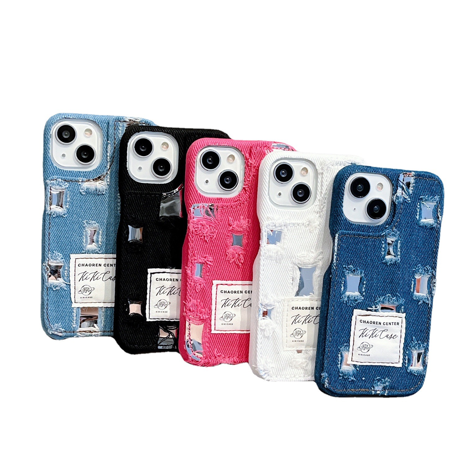 个性破洞牛仔布适用iPhone15promax手机壳苹果13镜子12小众女14潮