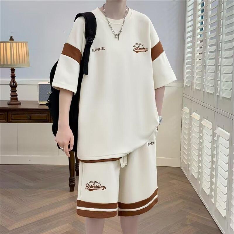 潮牌华夫格短袖t恤套装男生夏季痞帅半袖体恤衫五分裤搭配两件套