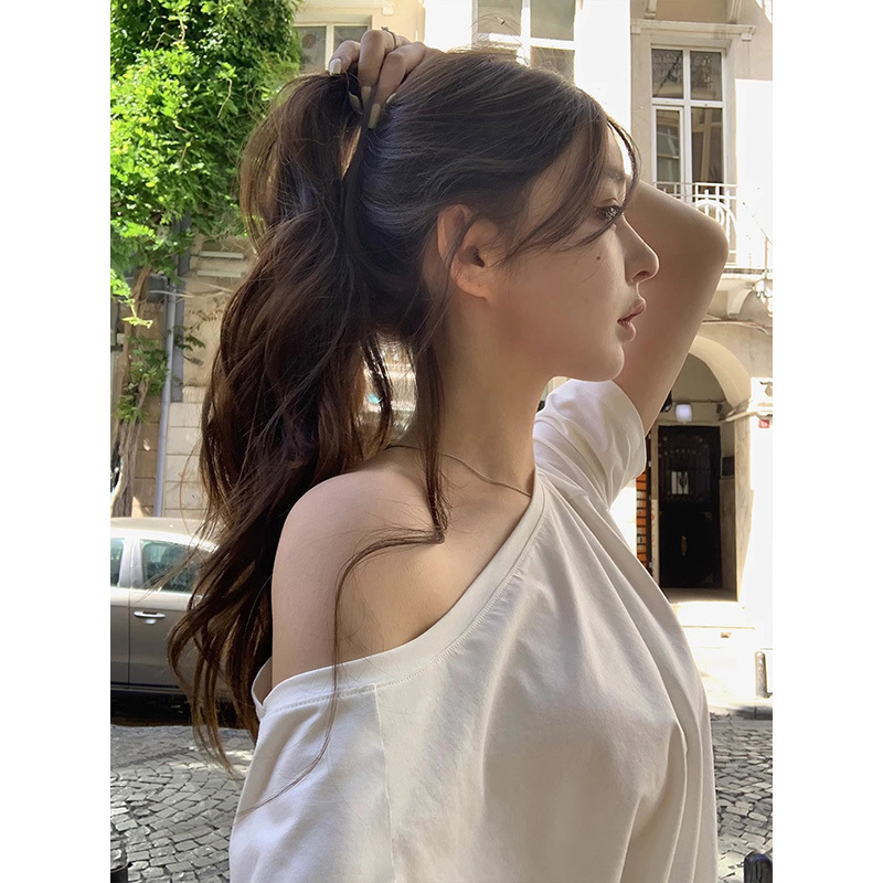 张婧仪同款慵懒斜肩纯棉短袖T恤女夏宽松休闲不规则白色简约上衣