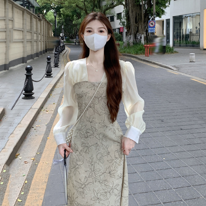 新中式国风水墨泡泡长袖连衣裙女春夏清冷感穿搭订婚修身方领长裙