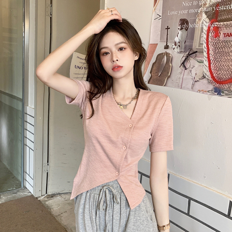 小众设计感不规则别致V领T恤女夏季新款甜辣妹修身显瘦短袖开衫潮