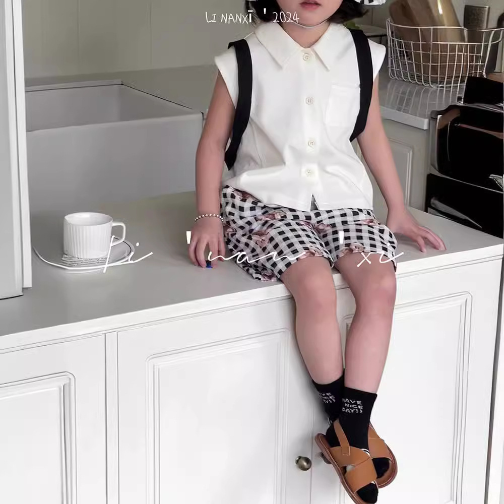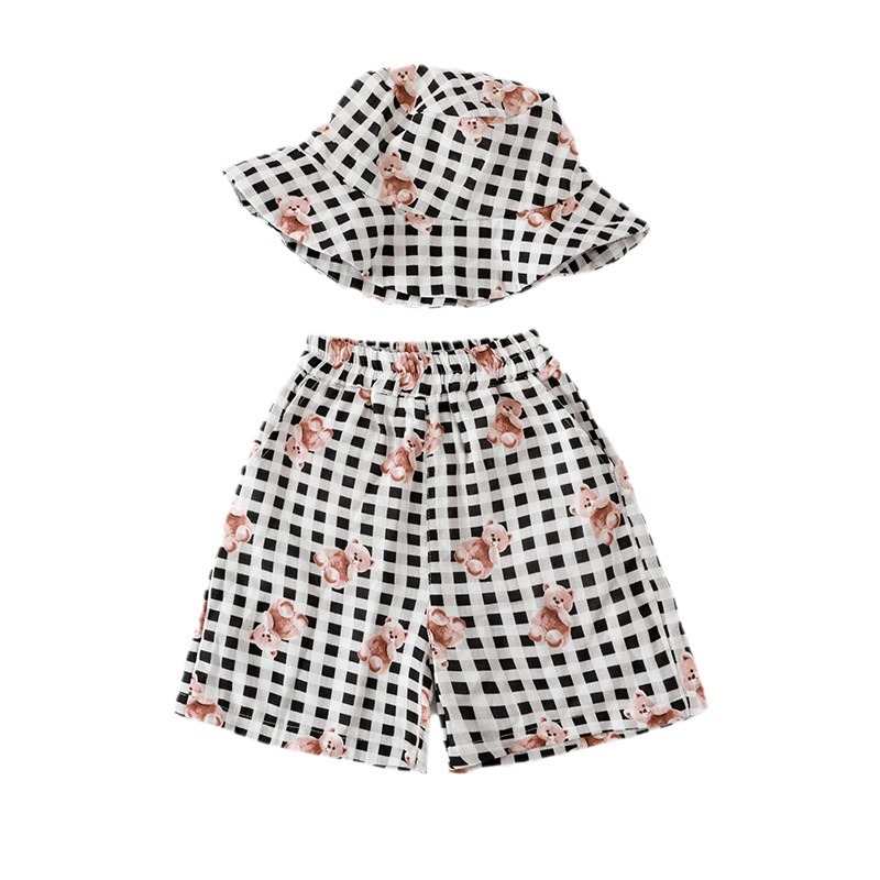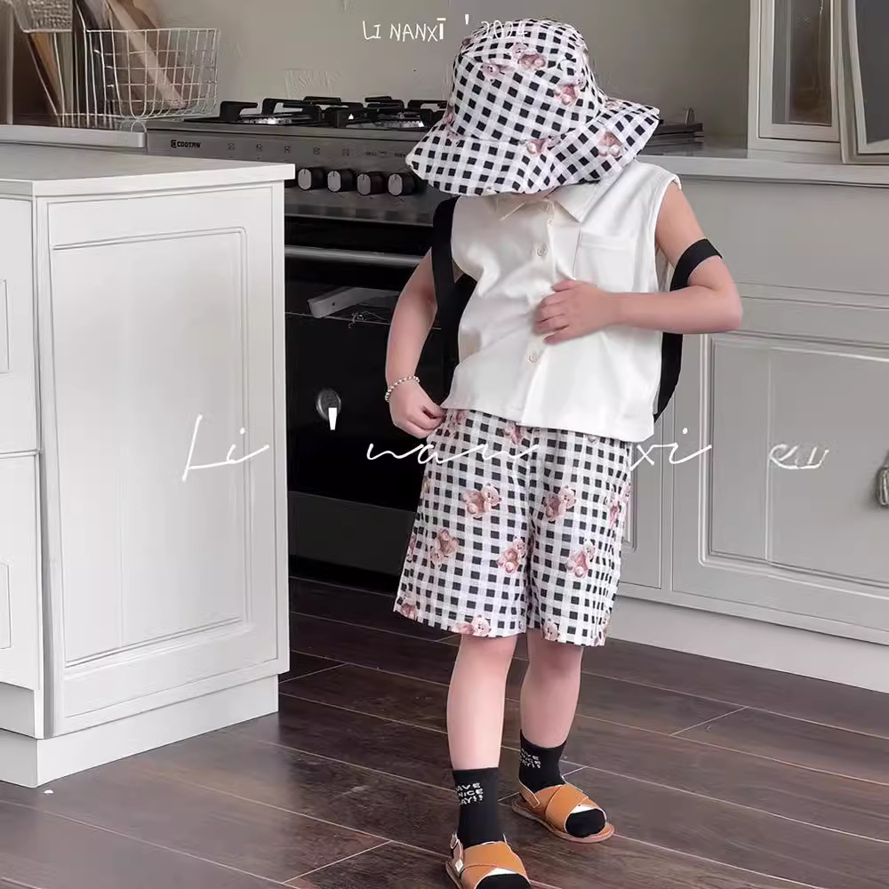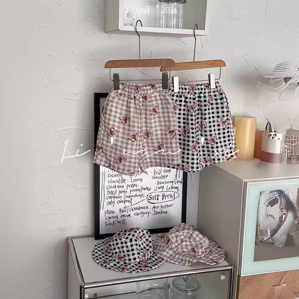 24夏新款儿童中裤双层棉纱裤送渔夫帽3-8岁宝宝太阳帽+中裤两件套