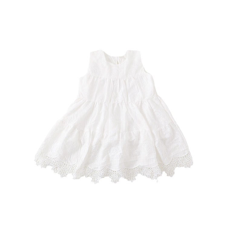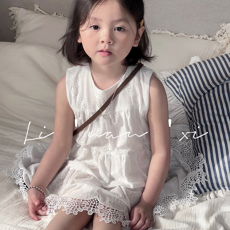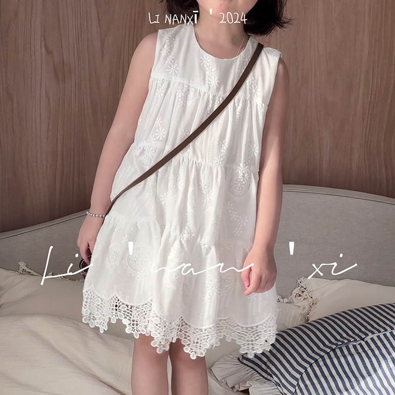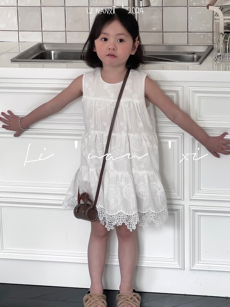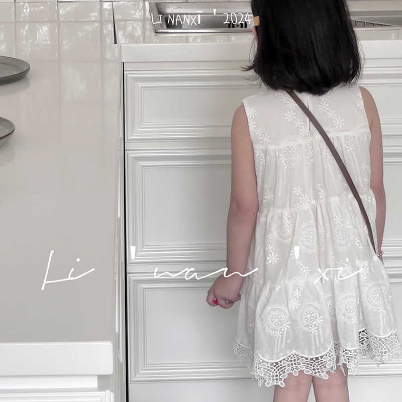女童宝宝夏季提花连衣裙24年夏季新款儿童无袖拼接款刺绣花边裙