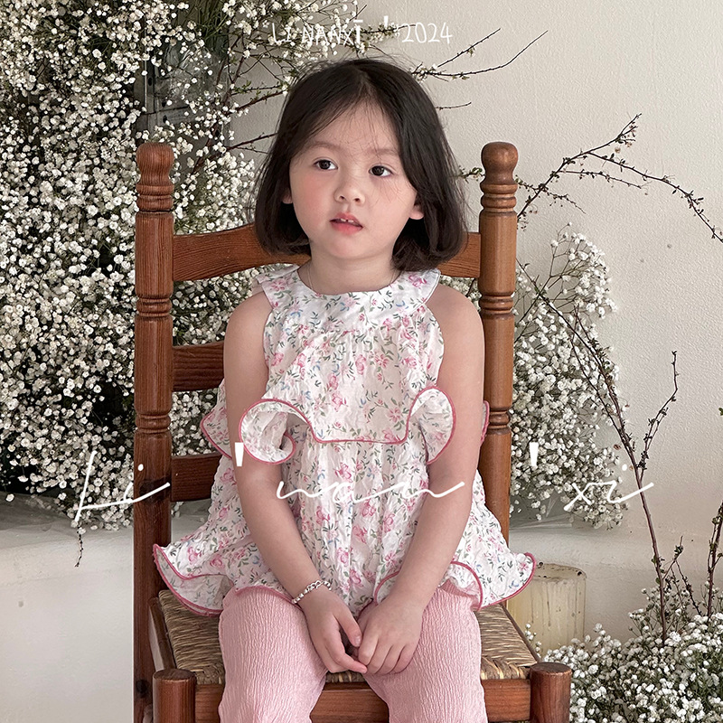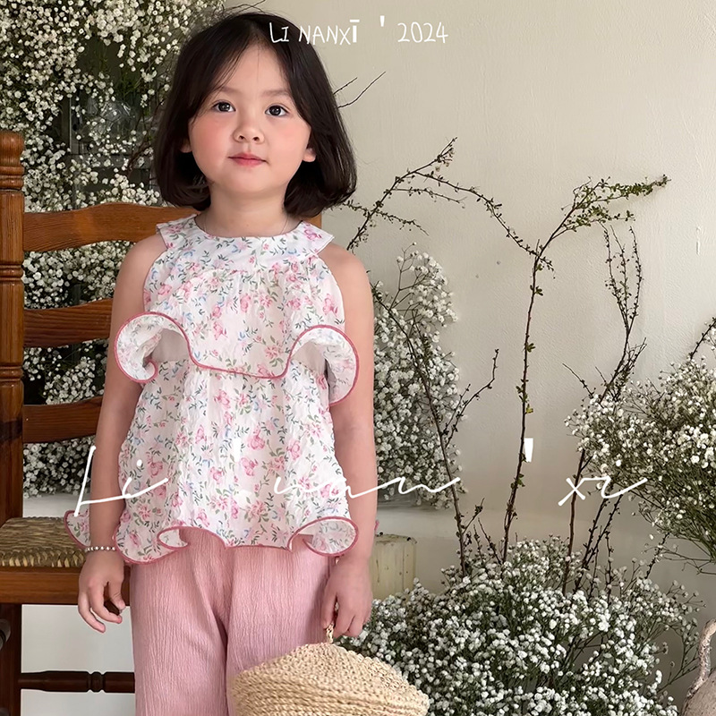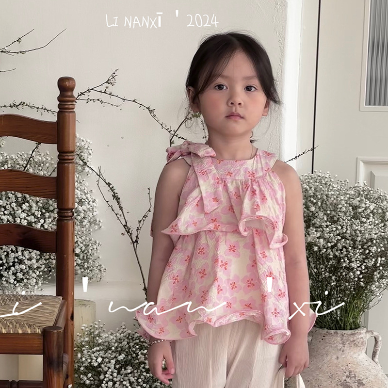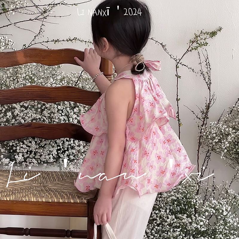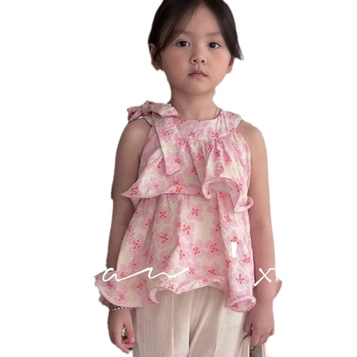 24夏新款女童娃娃上衣宝宝圆领蝴蝶结小碎花蓬蓬花吊带无袖公主衫
