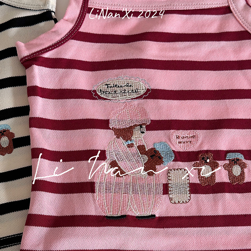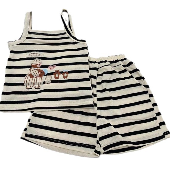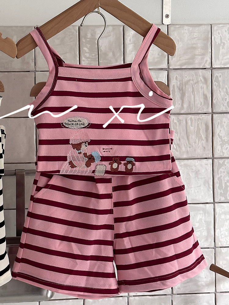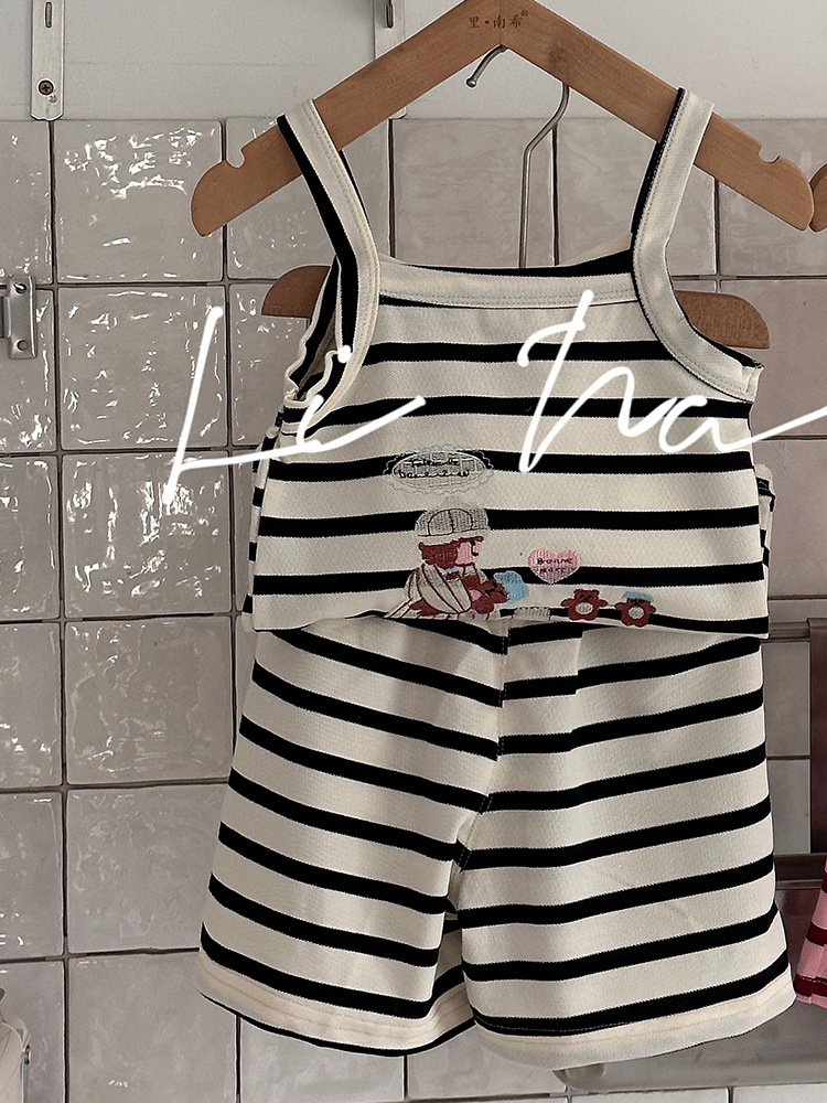 24夏新款儿童套装色织针织条纹女童两件套3-8岁宝宝吊带T短裤套装